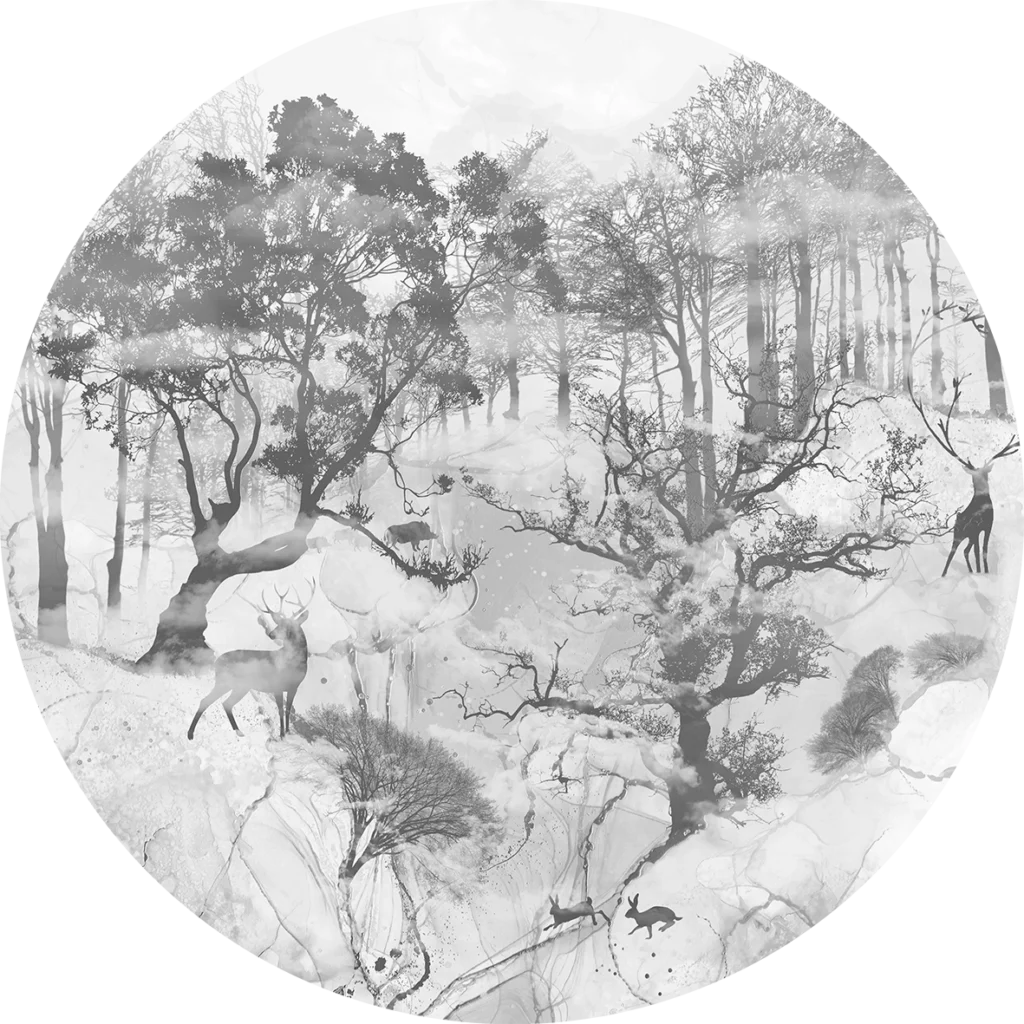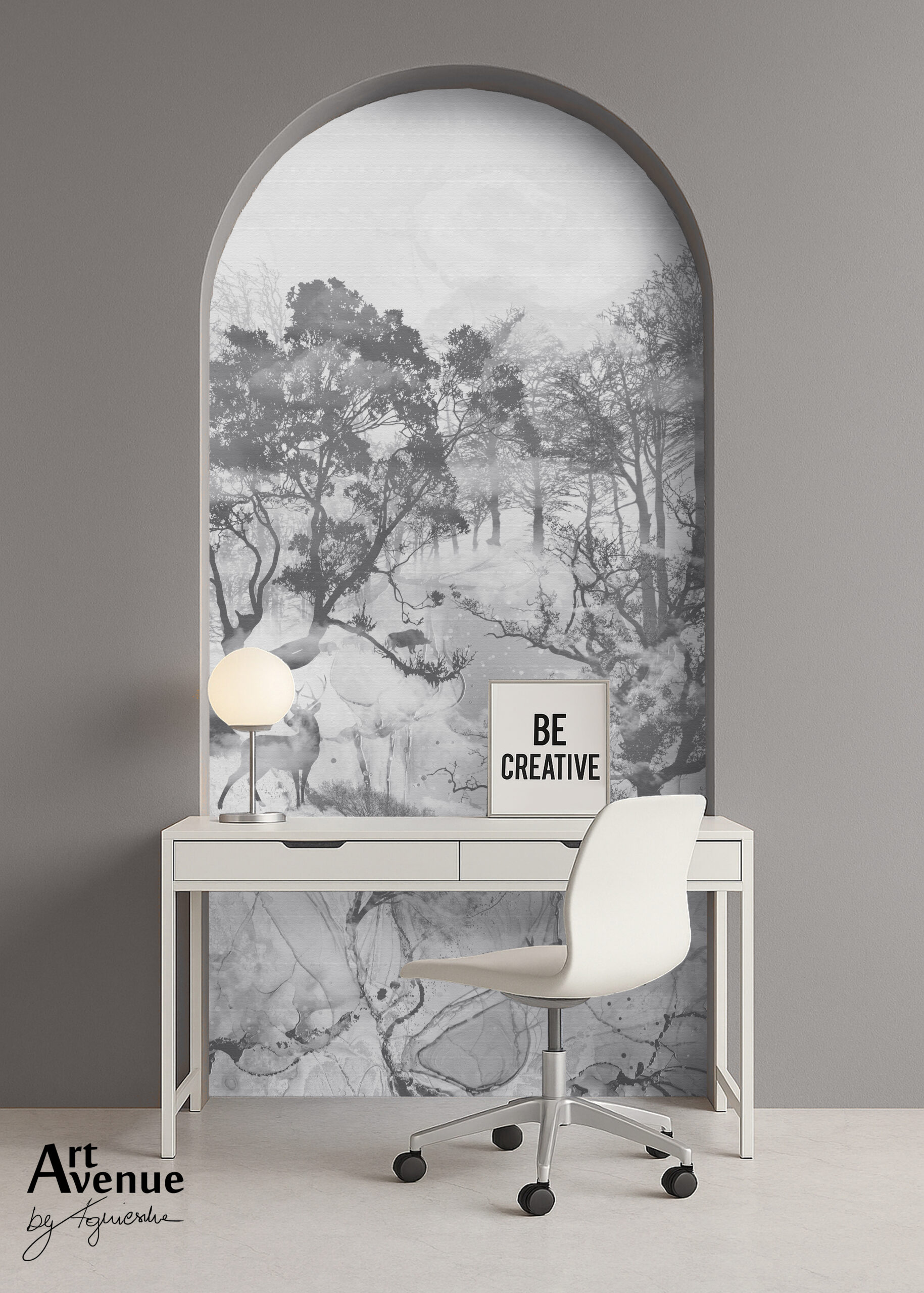 To monochromatyczna propozycja lasu we mgle o mistycznym klimacie z perspektywicznym rysunkiem pięknych gatunków drzew i leśnej fauny. Linearnie ujęta rzeźba terenu z dozą abstrakcji przedstawia wzgórza, wody i doliny. Artystyczna tapeta ścienna PREMIUM z motywem graficznym do zastosowania na ścianie, kaflach, meblach – w kształcie łuku o wymiarach 240×120 cm.