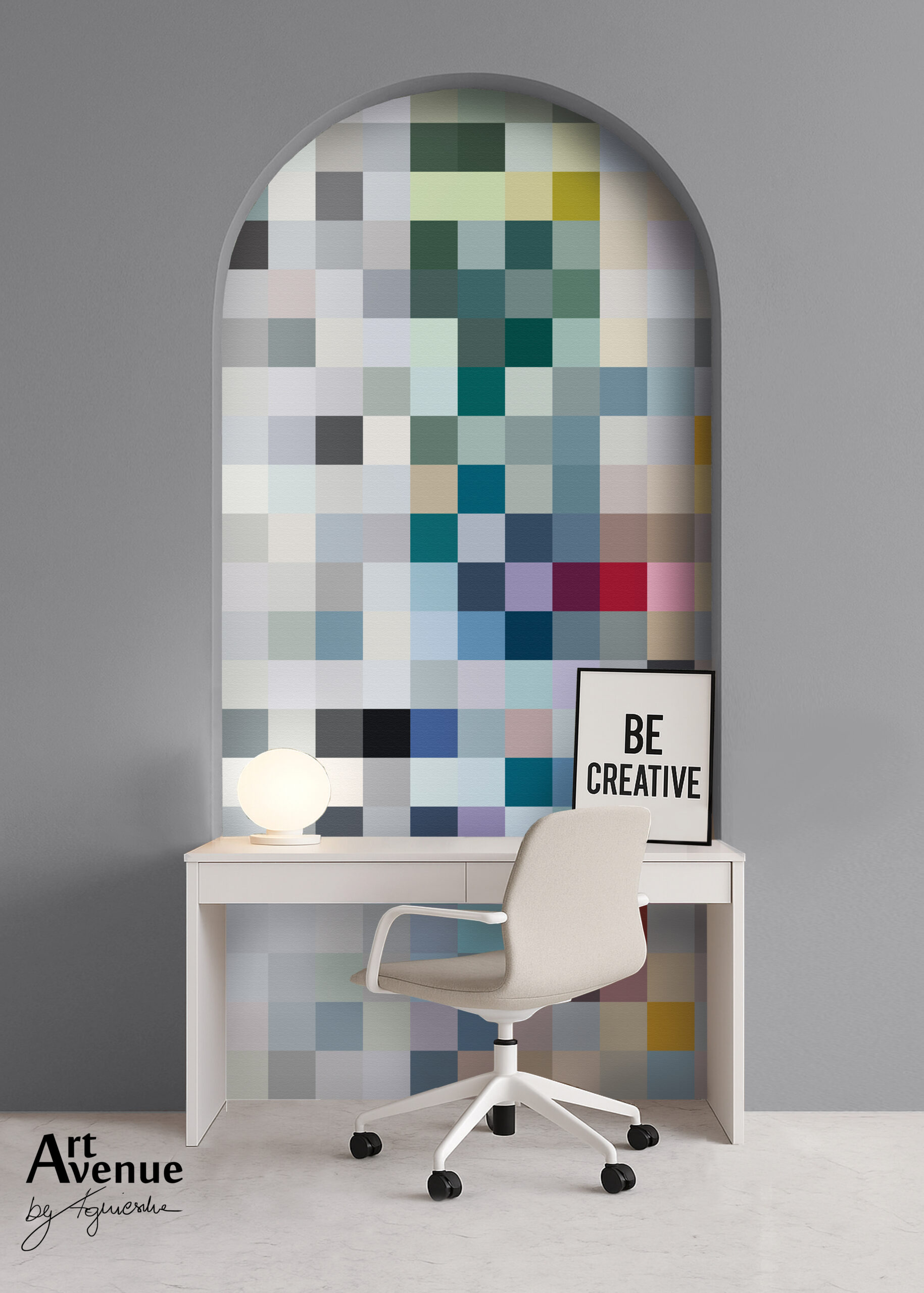 To swoista koloroterapia powstała z kwadratów o współgrających tonach zimnych i ciepłych z ożywczym, nieprzypadkowym kontrastem. Panele można komponować w dowolny sposób wybierając np. tylko te o chłodnej tonacji. Artystyczna tapeta ścienna PREMIUM z motywem graficznym do zastosowania na ścianie, kaflach, meblach – w kształcie łuku o wymiarach 240×120 cm.