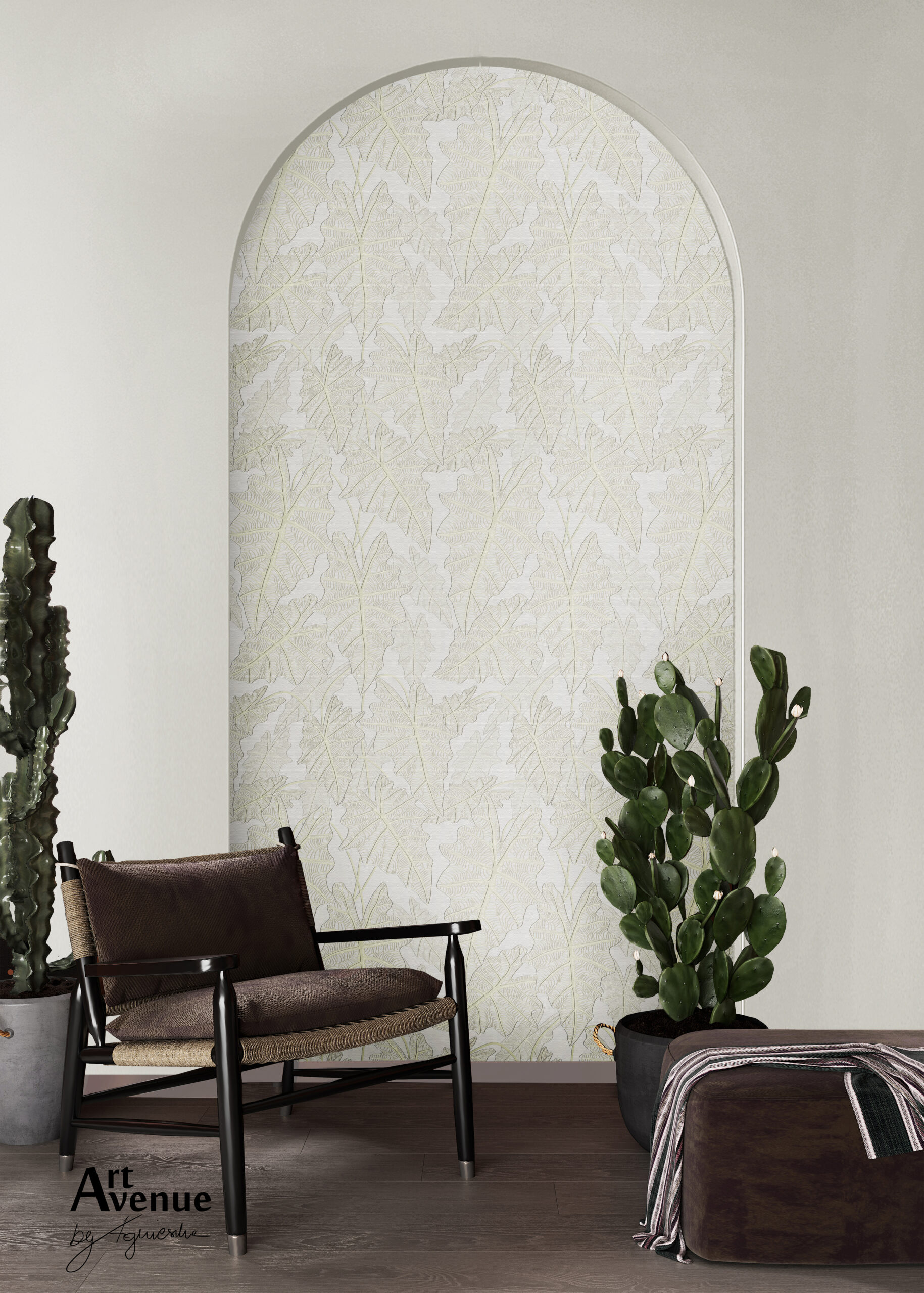 Off-white – niezawodna biel, którą przełamano delikatnym rysunkiem liści alokazji. Kontur oraz ciekawa nerwacja blaszek liściowych zbudowane poprzez reliefowe efekty przeplatają się wzajemnie ukazując głębie w bieli. Artystyczna tapeta ścienna PREMIUM z motywem botanicznym do zastosowania na ścianie, kaflach, meblach – w kształcie łuku o wymiarach 240×120 cm.