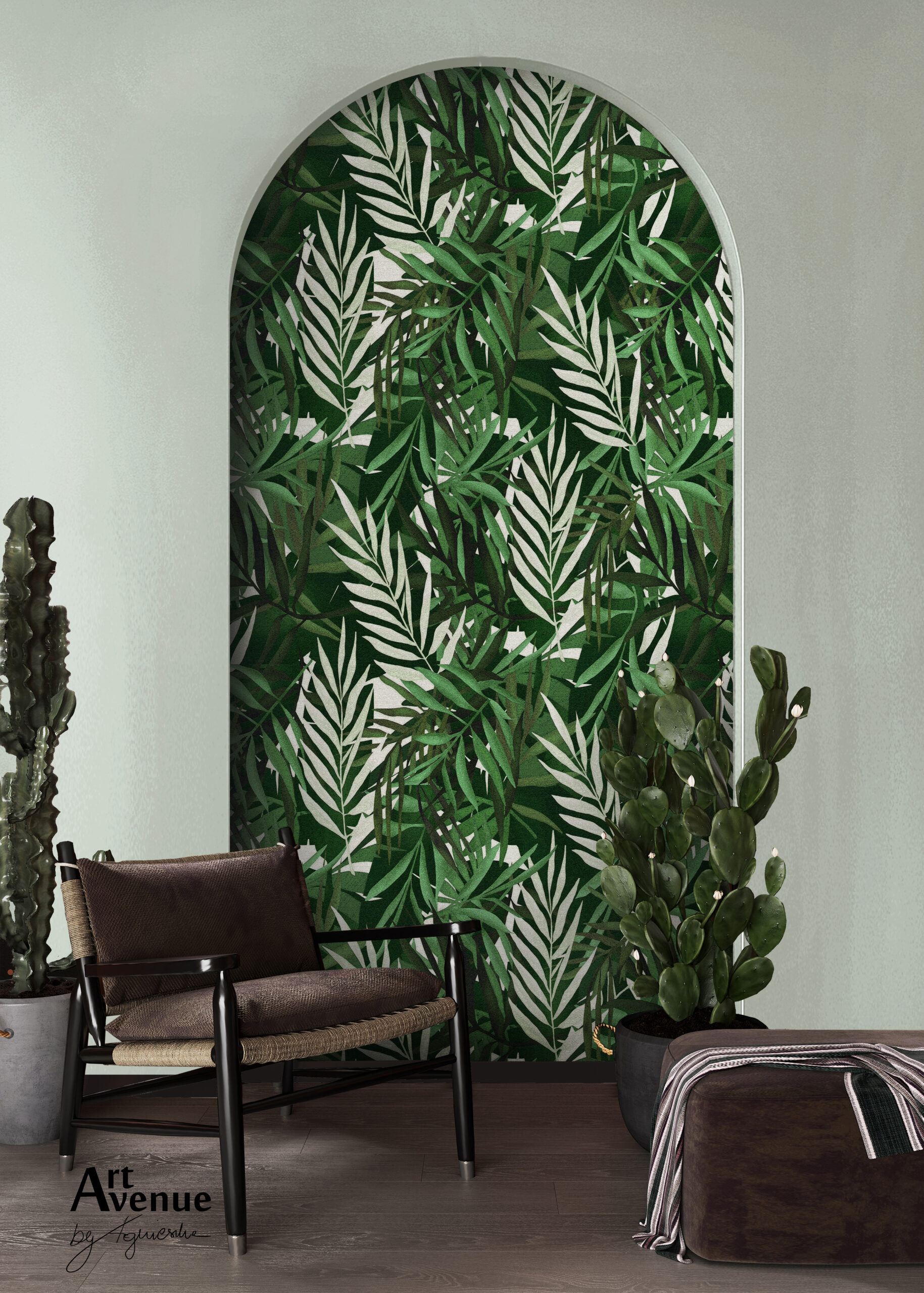 Grafika z tropikalnym zatrzęsieniem to zastępstwo w dobrym guście dla popularnej monstery. Na różnych płaszczyznach  tonów i tekstur opracowano oryginalny efekt, którego zastosowanie całkowicie odmieni wnętrze. Artystyczna tapeta ścienna PREMIUM z motywem graficznym do zastosowania na ścianie, kaflach, meblach – w kształcie łuku o wymiarach 240×120 cm.
