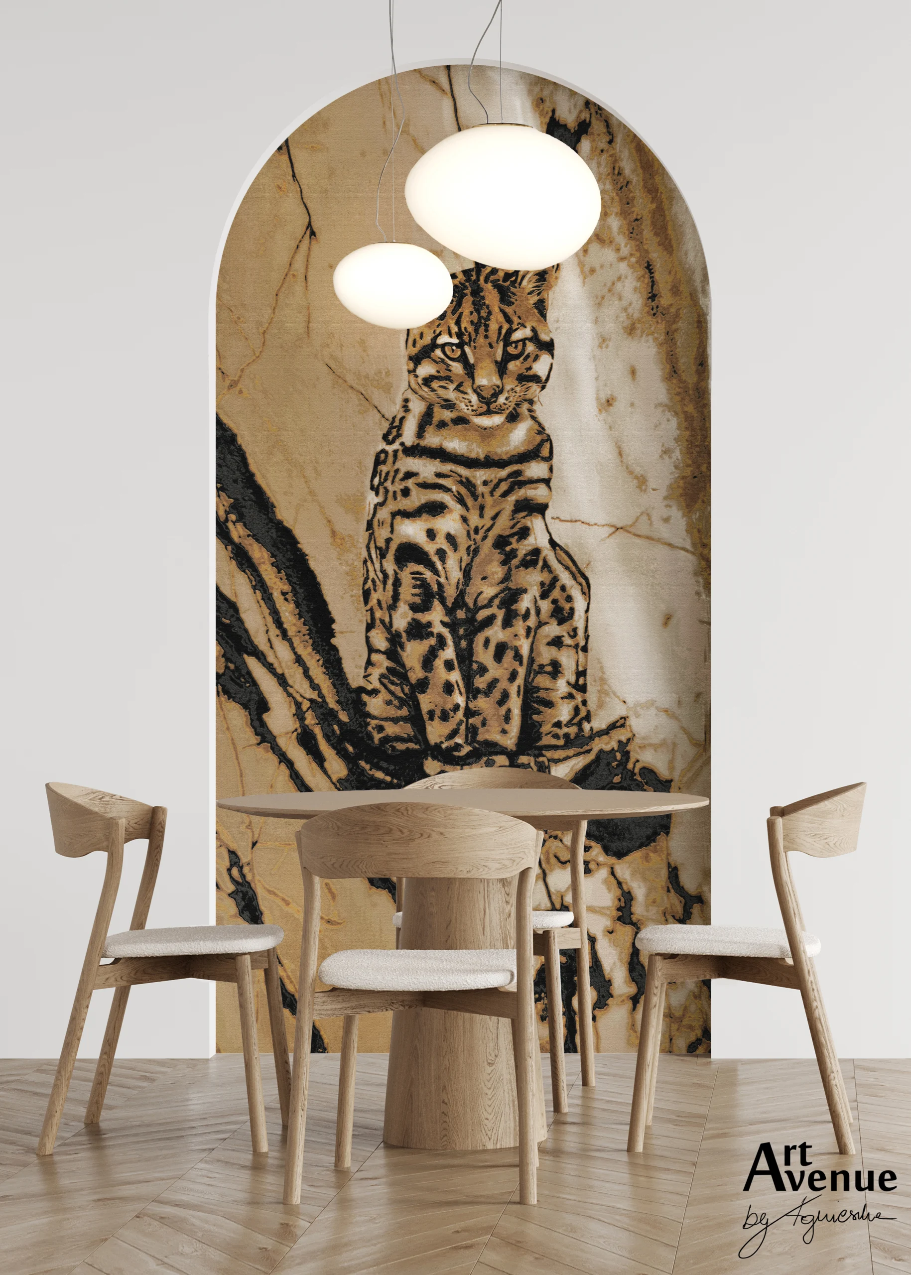 Wyjątkowy, ręcznie rysowany ocelot siedzący na ujętym wrażeniowo konarze. Ten znakomity reprezentant sawanny w piaskowo-złocistych barwach z efektownym tłem marmurkowym nada wnętrzu oryginalny i wyjątkowy charakter. Artystyczna tapeta ścienna PREMIUM z organicznym wzorem do zastosowania na ścianie, kaflach, meblach – w kształcie łuku o wymiarach 240×120 cm.