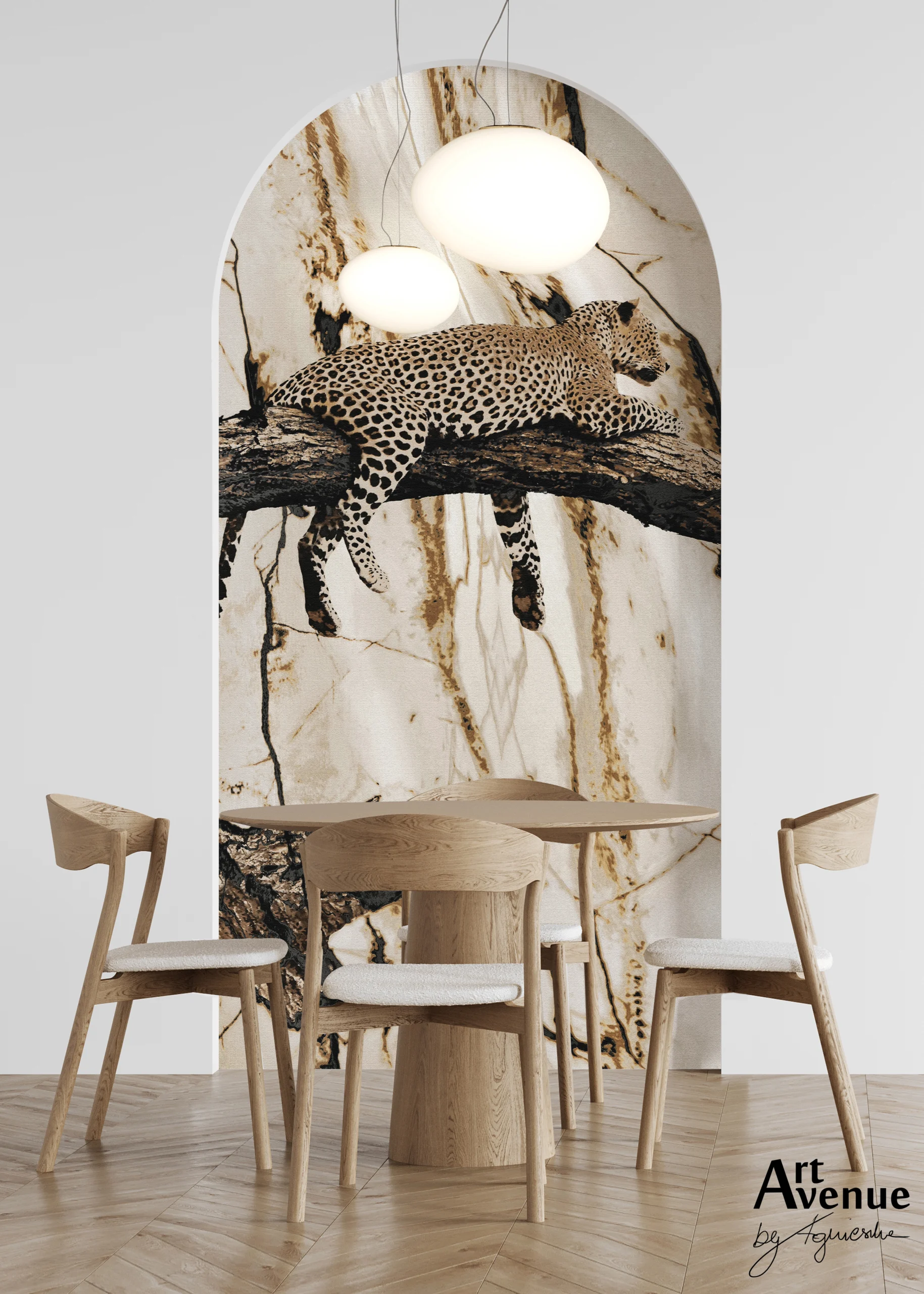 Dedykowana do ekskluzywnych wnętrz dzięki połączeniu piaskowego marmuru z brązowo-złotym i czarnym kontrastem. Zwieszony lampart to HIT – prezentowany nad wanną nada Twojej łazience dzikiego charakteru. Artystyczna tapeta ścienna PREMIUM z organicznym wzorem do zastosowania na ścianie, kaflach, meblach – w kształcie łuku o wymiarach 240×120 cm.