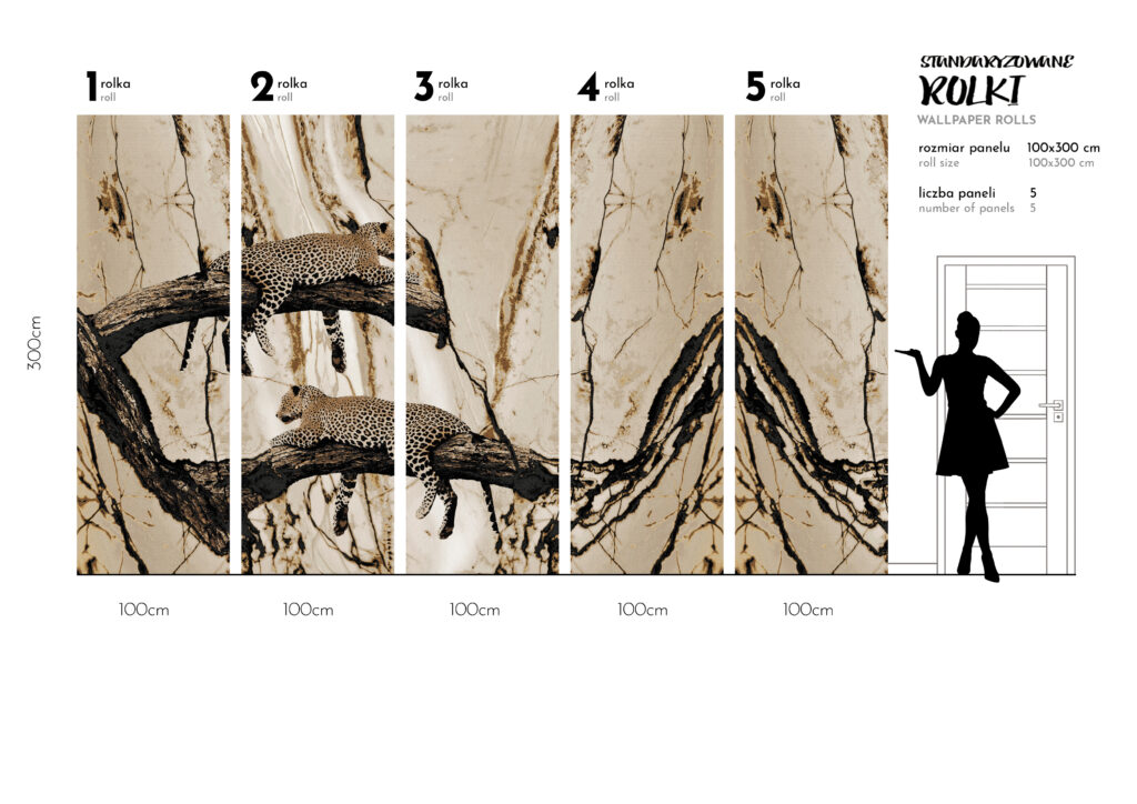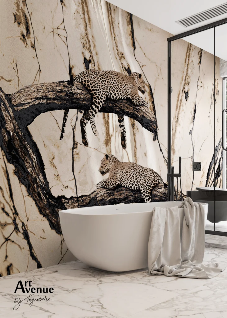 Dedykowana do ekskluzywnych wnętrz dzięki połączeniu piaskowego marmuru z brązowo-złotym i czarnym kontrastem. Zwieszony lampart to HIT – prezentowany nad wanną nada Twojej łazience dzikiego charakteru. Artystyczna tapeta ścienna PREMIUM z organicznym wzorem do zastosowania na ścianie, kaflach, meblach – w kształcie łuku o wymiarach 240×120 cm.