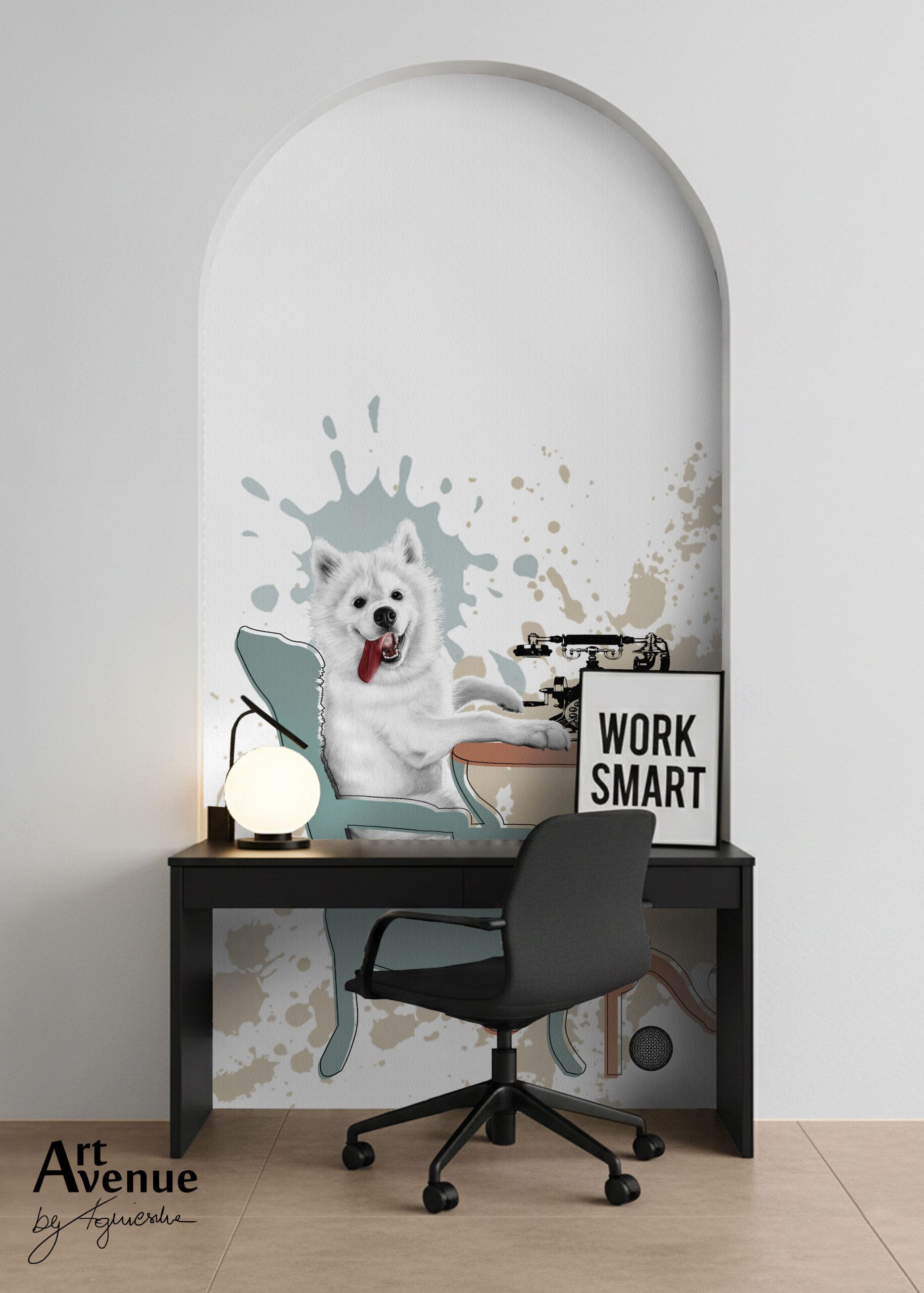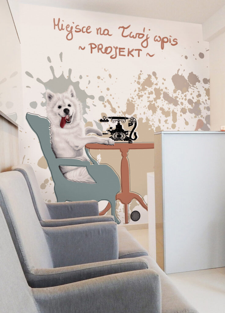 Tematyczna propozycja grafiki z motywem wesołego psa stworzona z myślą o gabinetach weterynaryjnych (analogicznie do wzoru#79) jednakże w ofercie pojawia się sugestia personalizacji – miejsce na Twój wpis/cytat/grafikę/logo firmy. Artystyczna tapeta ścienna PREMIUM z motywem graficznym do zastosowania na ścianie, kaflach, meblach – w kształcie łuku o wymiarach 240×120 cm.