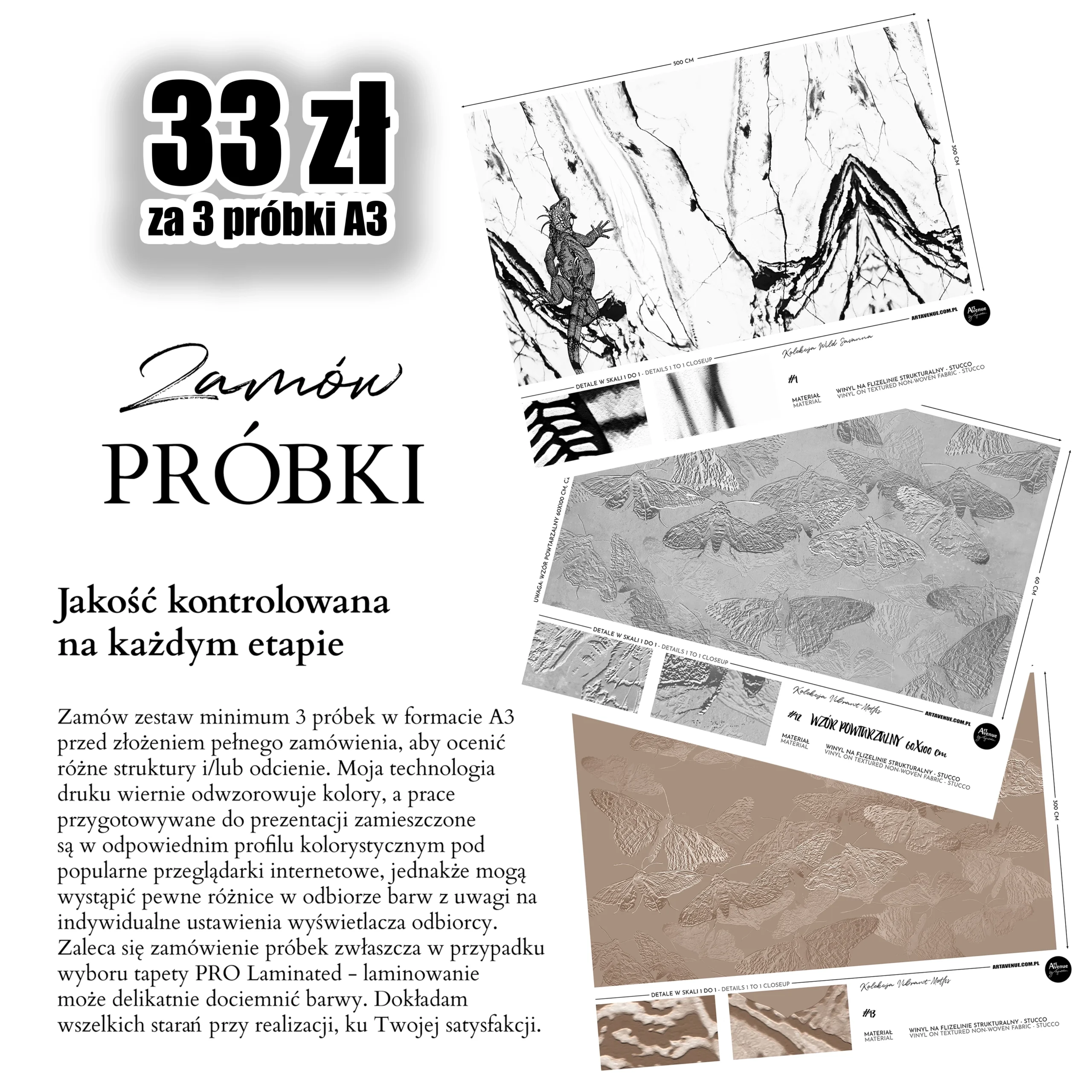 Poznaj ich właściwości i piękne struktury oraz sprawdź wybrany wzór i odcień. Zakup zestawu próbek A3 za jedyne 33 zł pozwoli Ci upewnić się co do słuszności Twojego wyboru zakupu całej tapety. Materiały w jakości PREMIUM, w tym wariant ECO (bez PCV).