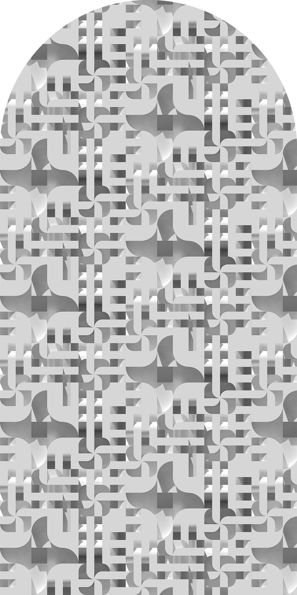 Zaprojektowana została na bazie projektu modułu, który skalowany i obracany jak w Kostce Rubika łączy się w abstrakcyjne wzory wiatraków i przejścia 3D. Jest to elegancka kompozycja strukturalna w szarości. Artystyczna tapeta ścienna PREMIUM z motywem graficznym do zastosowania na ścianie, kaflach, meblach – w kształcie łuku o wymiarach 240×120 cm.