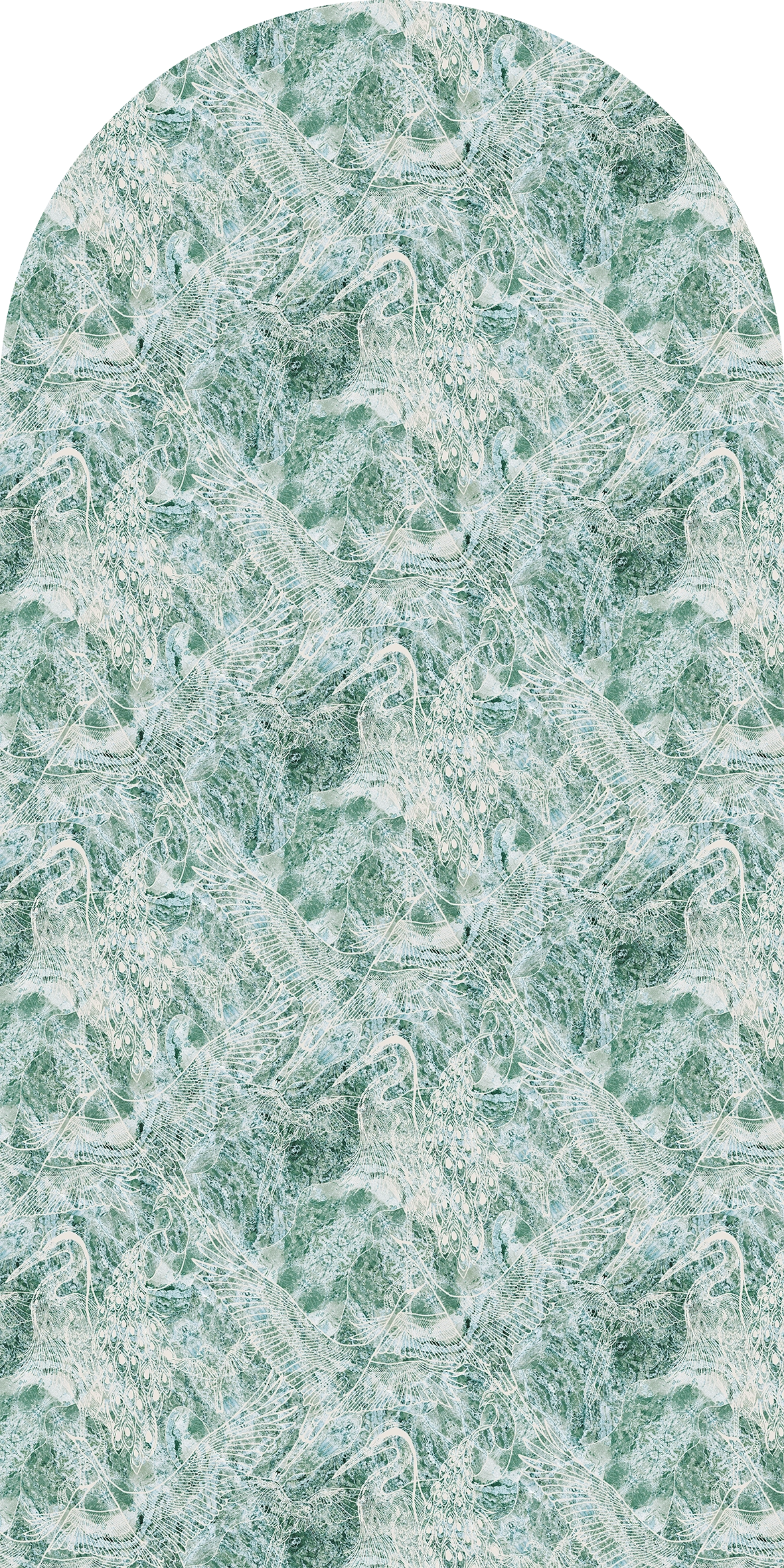 Zawiera w sobie przepiękny wzór linearny z uwielbianymi motywami ptaków jak np. czapla, paw, żuraw, który subtelnie przebija z melanżu kolorów niebieskich i zielonych faktur tworząc artystyczny charakter ściany. Artystyczna tapeta ścienna PREMIUM z motywem graficznym do zastosowania na ścianie, kaflach, meblach – w kształcie łuku o wymiarach 240×120 cm.