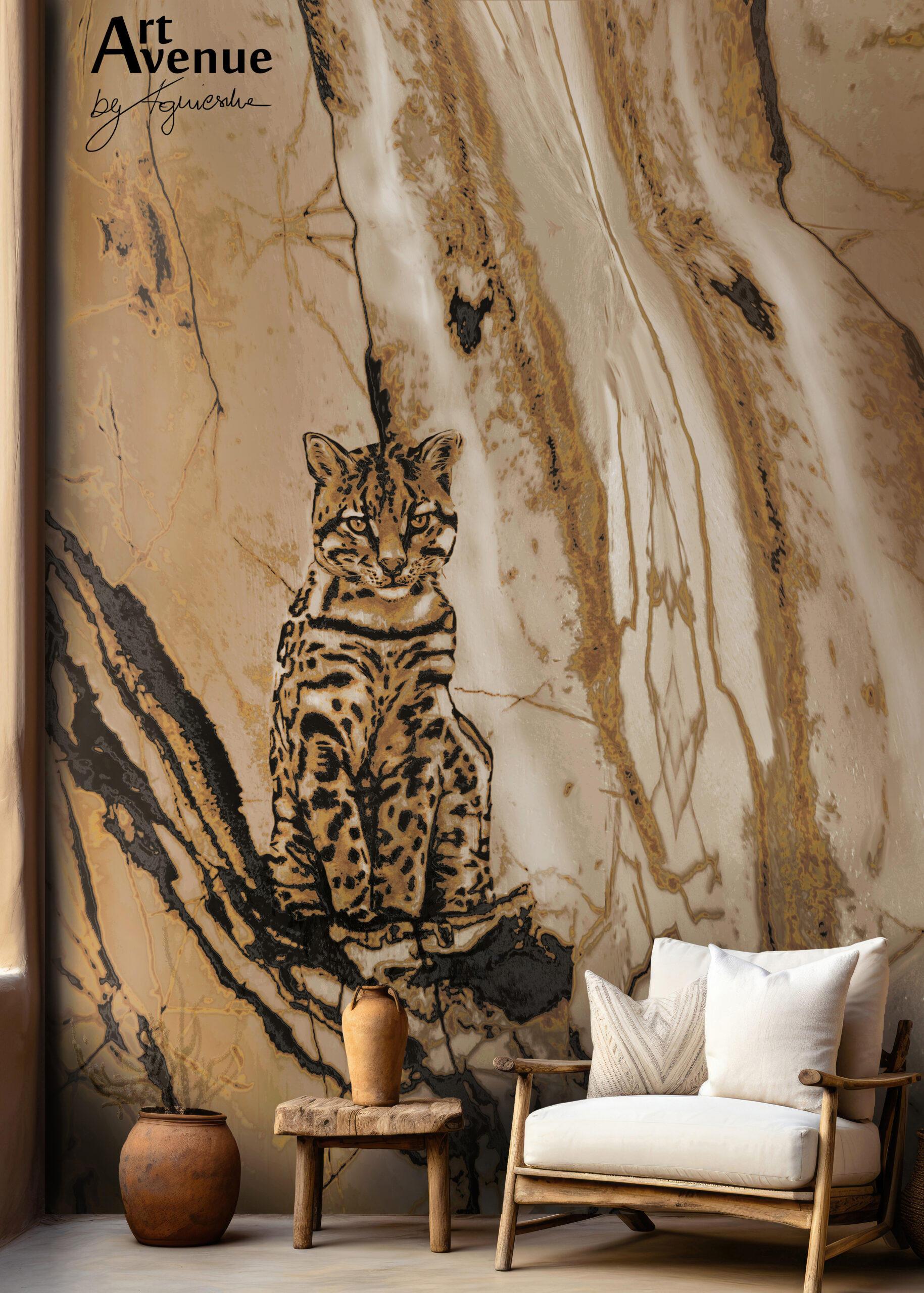 Wyjątkowy, ręcznie rysowany ocelot siedzący na ujętym wrażeniowo konarze. Ten znakomity reprezentant sawanny w piaskowo-złocistych barwach z efektownym tłem marmurkowym nada wnętrzu oryginalny i wyjątkowy charakter Safari. Artystyczna tapeta ścienna PREMIUM z organicznie wtopionym wzorem – na wymiar.