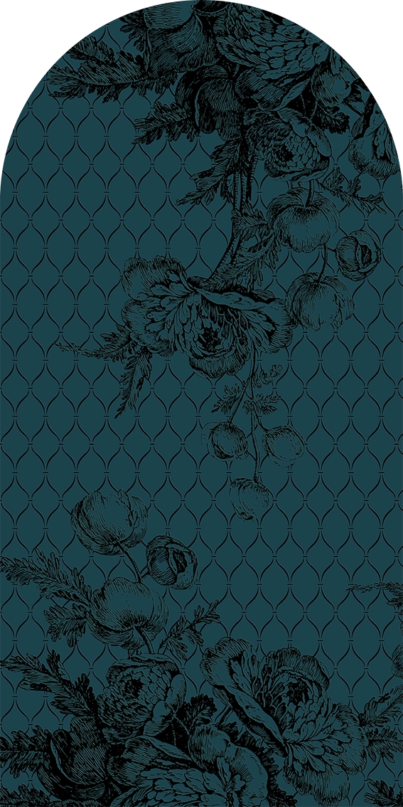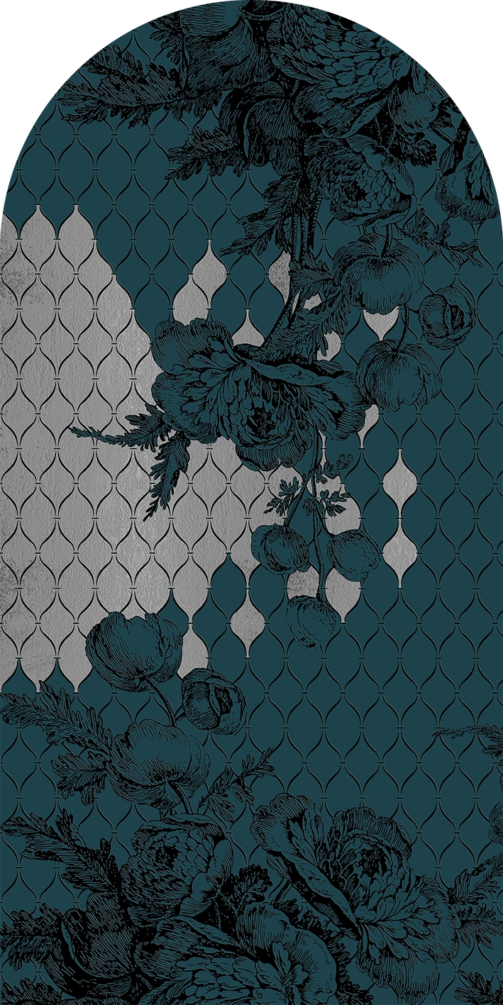 Eleganckie połączenie kwiatowej grafiki z ciekawą mozaiką na tle ciemnego turkusu z miejscowo dodanym efektem imitującym srebro. Stanowi wyjątkowe zestawienie kilku trendów z pięknym wzorem. Artystyczna tapeta ścienna PREMIUM z motywem graficznym do zastosowania na ścianie, kaflach, meblach – w kształcie łuku o wymiarach 240×120 cm.