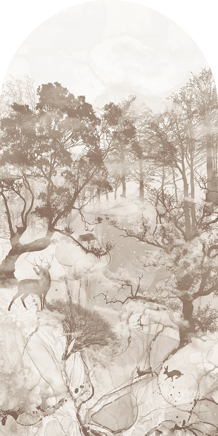 Przedstawia mglisty, nieco bajkowy las pełen tajemnic. Jest grafiką o abstrakcyjnym podłożu; w jej perspektywie ujrzysz urocze sylwetki leśnych zwierząt, które przeniosą Cię jak przez portal do świata pięknych fantazji. Artystyczna tapeta ścienna PREMIUM z motywem graficznym do zastosowania na ścianie, kaflach, meblach – w kształcie łuku o wymiarach 240×120 cm.