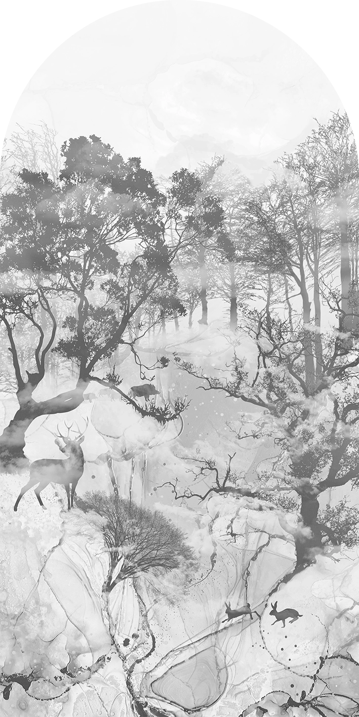 To monochromatyczna propozycja lasu we mgle o mistycznym klimacie z perspektywicznym rysunkiem pięknych gatunków drzew i leśnej fauny. Linearnie ujęta rzeźba terenu z dozą abstrakcji przedstawia wzgórza, wody i doliny. Artystyczna tapeta ścienna PREMIUM z motywem graficznym do zastosowania na ścianie, kaflach, meblach – w kształcie łuku o wymiarach 240×120 cm.
