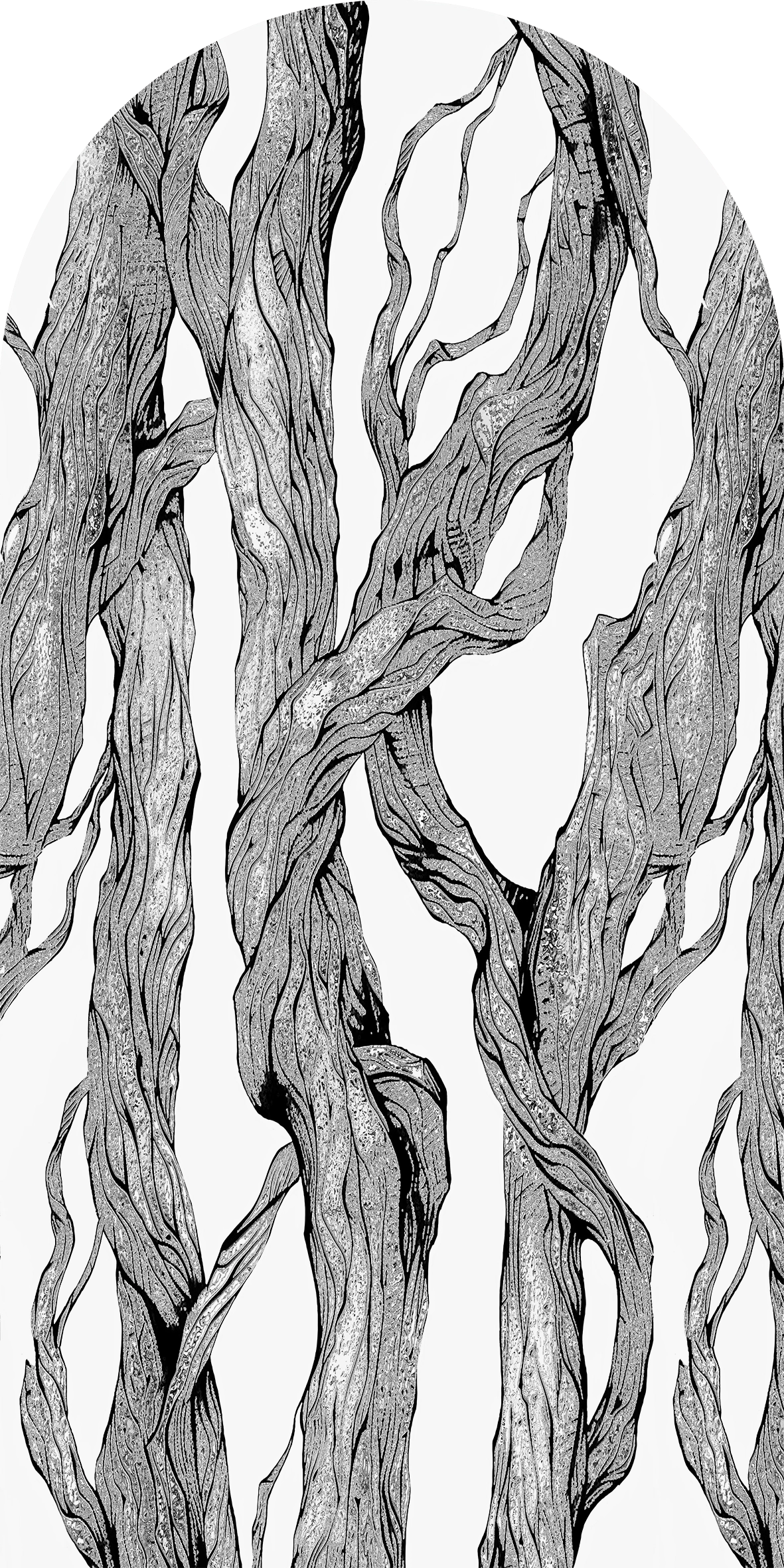 Dekoracyjna propozycja o artystycznym charakterze, stworzona z gęsto splątanych konarów tworzących rytmicznych układ. Czarno biała kreska wprowadza wyrazisty kontrast i naturalną strukturę. Przenosi do świata leśnych tajemnic. Artystyczna tapeta ścienna PREMIUM z motywem graficznym do zastosowania na ścianie, kaflach, meblach – w kształcie łuku o wymiarach 240×120 cm.