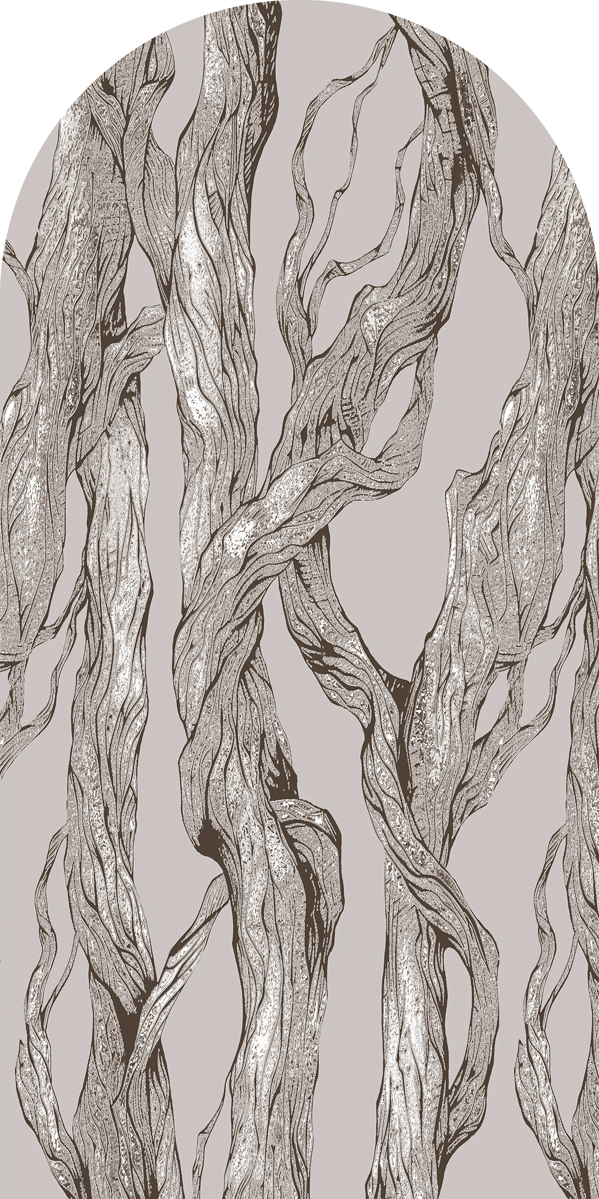 Elegancka, beżowa wariacja graficzna z motywem leśnym. Naturalne sploty konarów zyskały więcej głębi i wyrafinowania dzięki beżowym tonom, nadając wnętrzu przytulności. Świetna do aranżacji inspirowanych naturą i drewnem. Artystyczna tapeta ścienna PREMIUM z motywem graficznym do zastosowania na ścianie, kaflach, meblach – w kształcie łuku o wymiarach 240×120 cm.