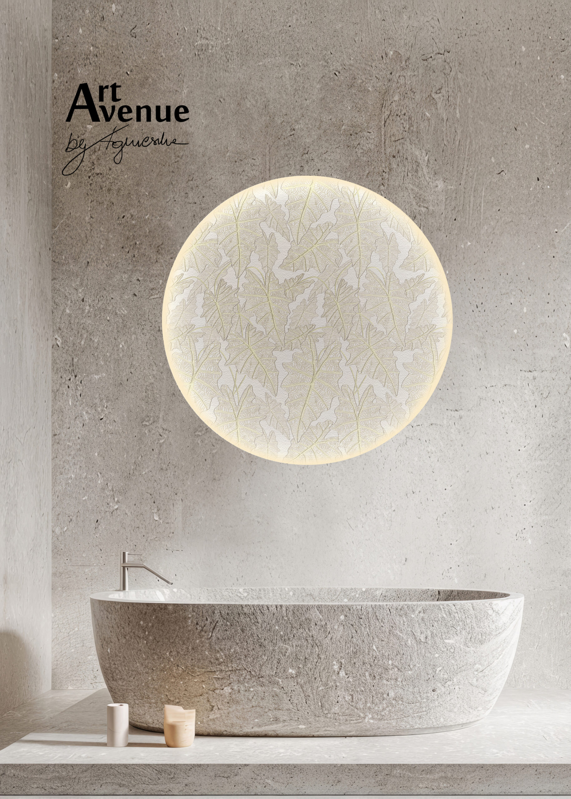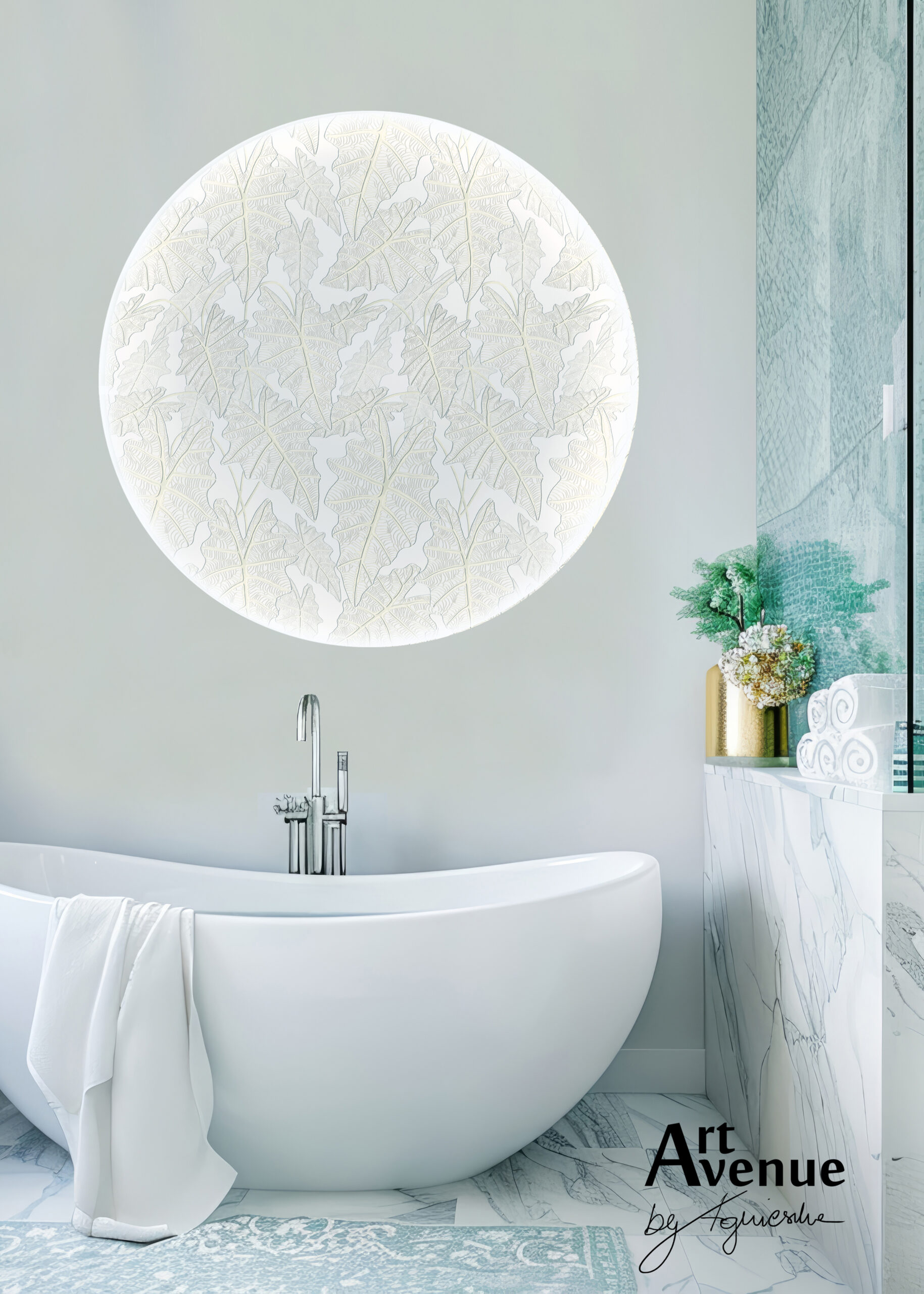 Off-white – niezawodna biel, którą przełamano delikatnym rysunkiem liści alokazji. Kontur oraz ciekawa nerwacja blaszek liściowych zbudowane poprzez reliefowe efekty przeplatają się wzajemnie ukazując głębie w bieli. Artystyczna tapeta ścienna PREMIUM z motywem botanicznym do zastosowania na ścianie, kaflach, meblach – w kształcie koła o średnicy 120 cm.