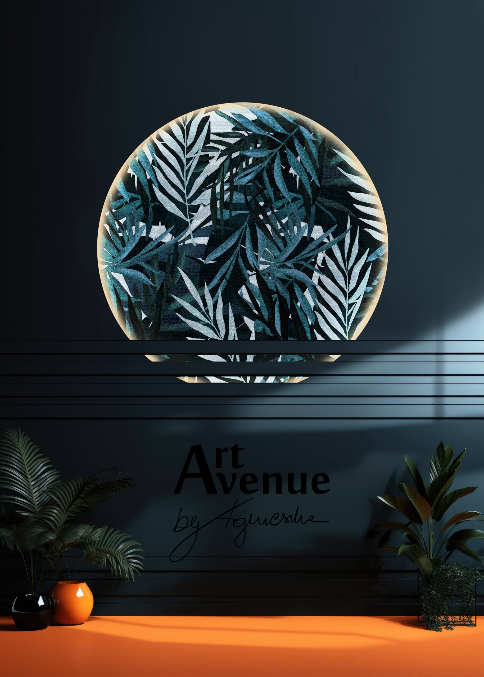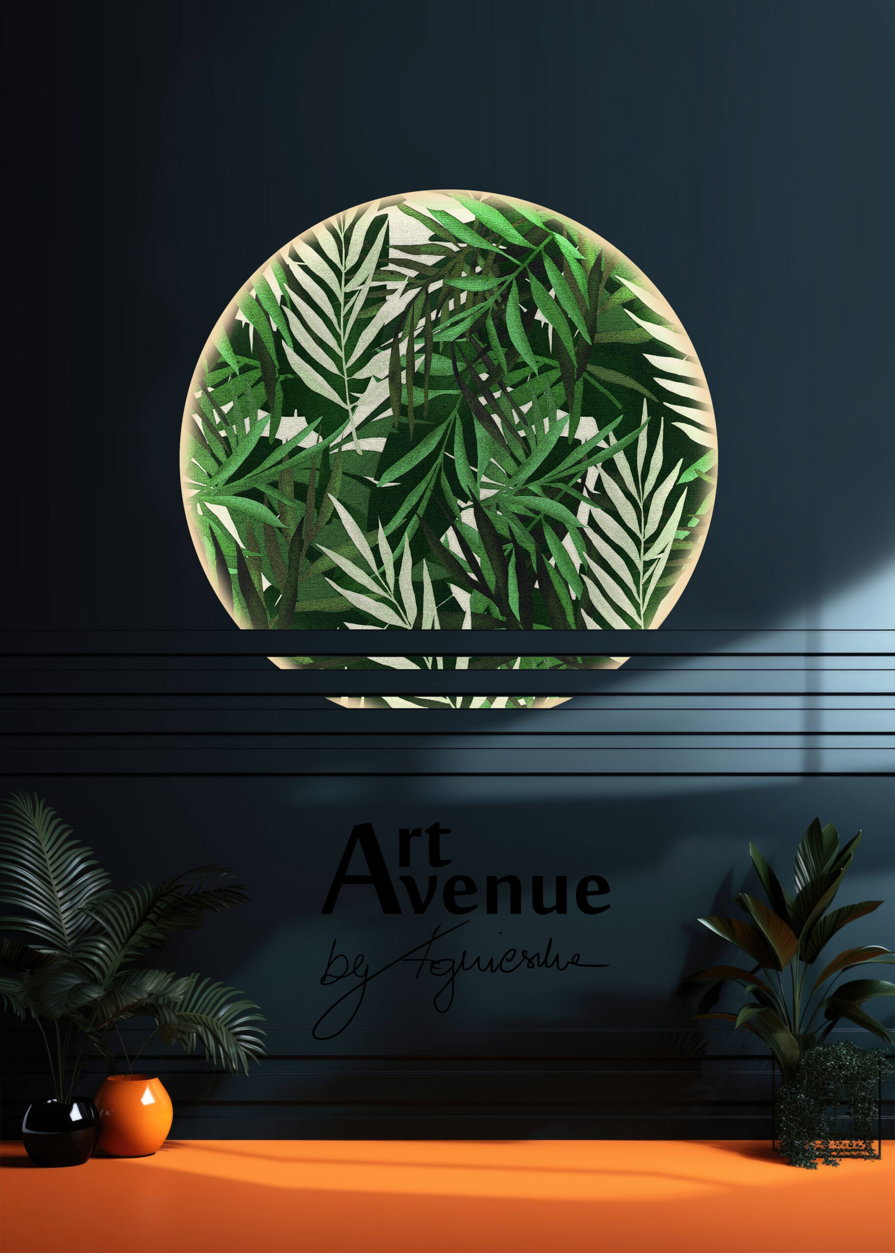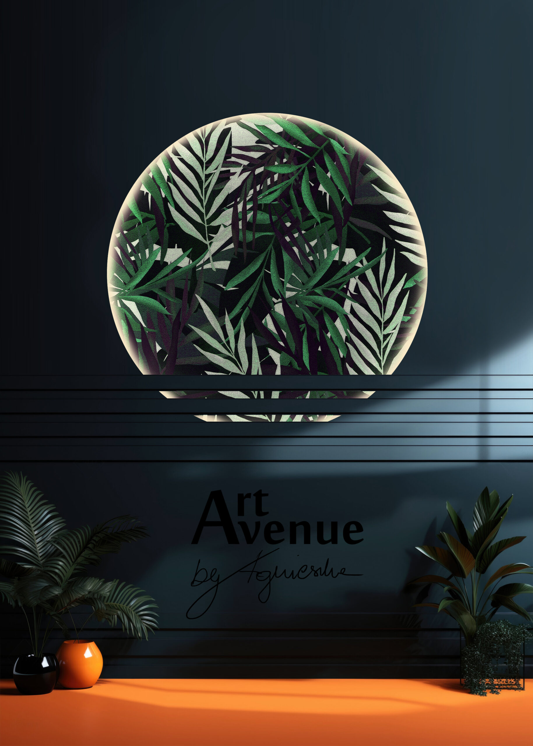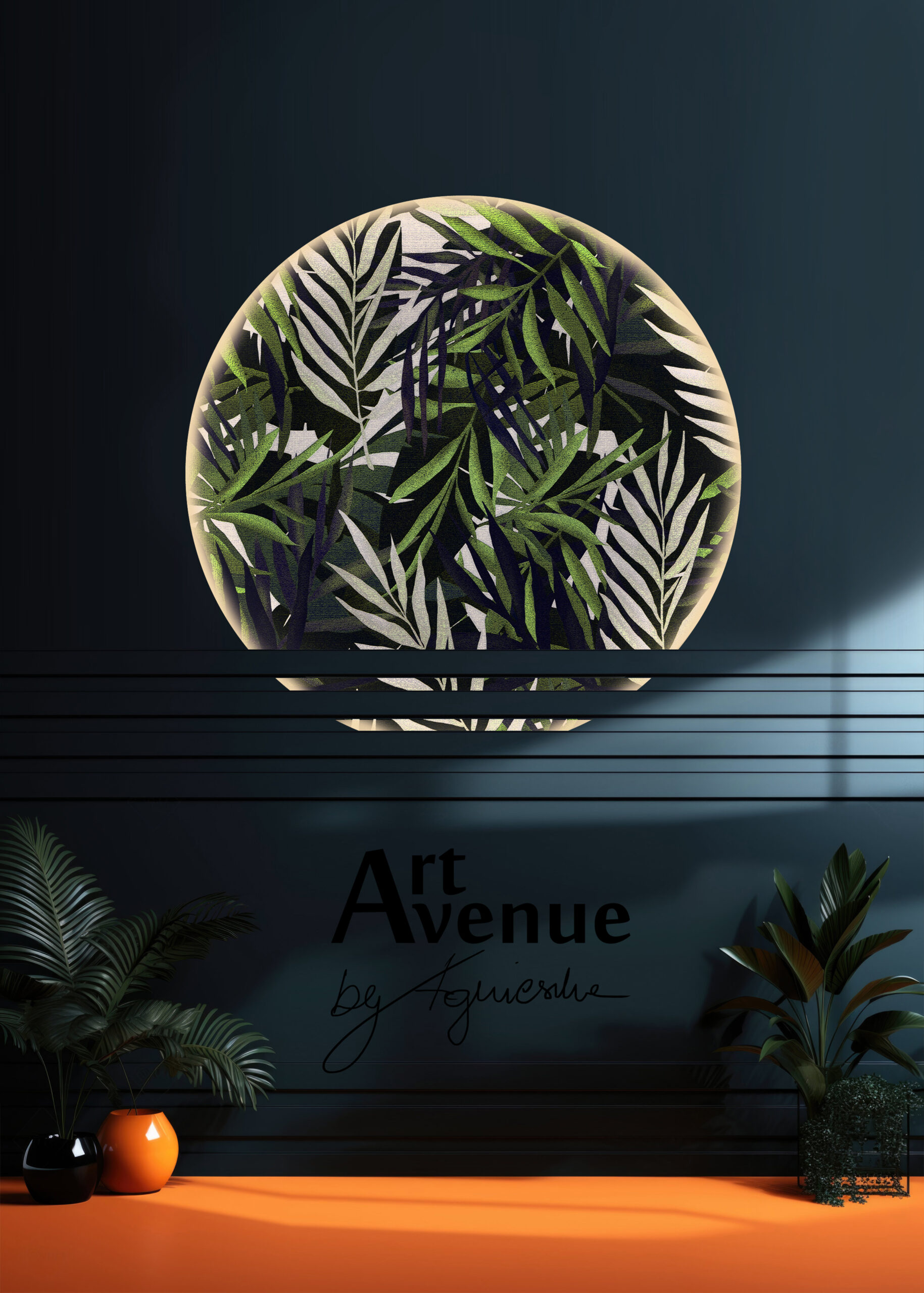 Grafika z tropikalnym zatrzęsieniem to zastępstwo w dobrym guście dla popularnej monstery. Na różnych płaszczyznach  tonów i tekstur opracowano oryginalny efekt, którego zastosowanie całkowicie odmieni wnętrze. Artystyczna tapeta ścienna PREMIUM z motywem graficznym do zastosowania na ścianie, kaflach, meblach – w kształcie koła o średnicy 120 cm.