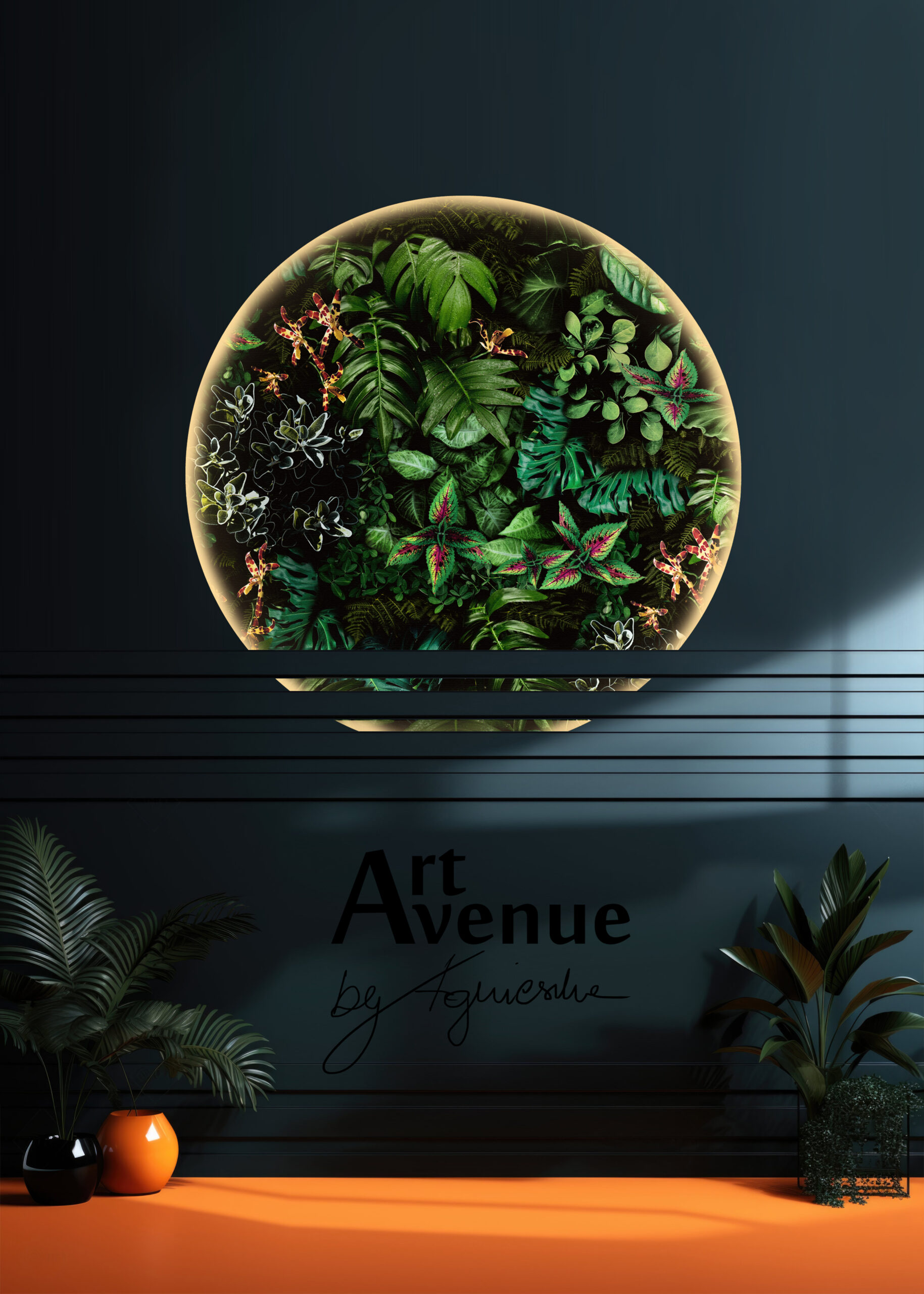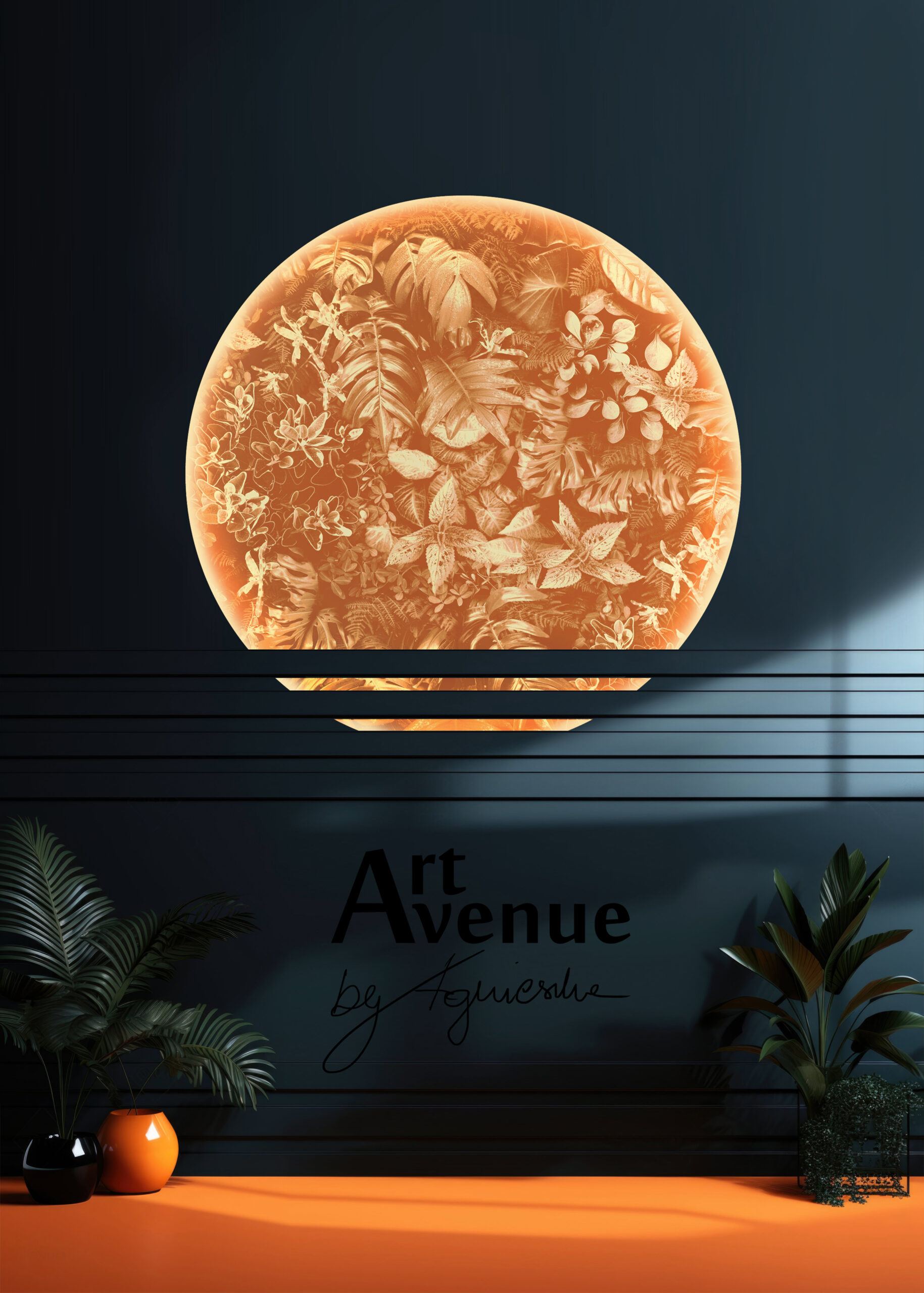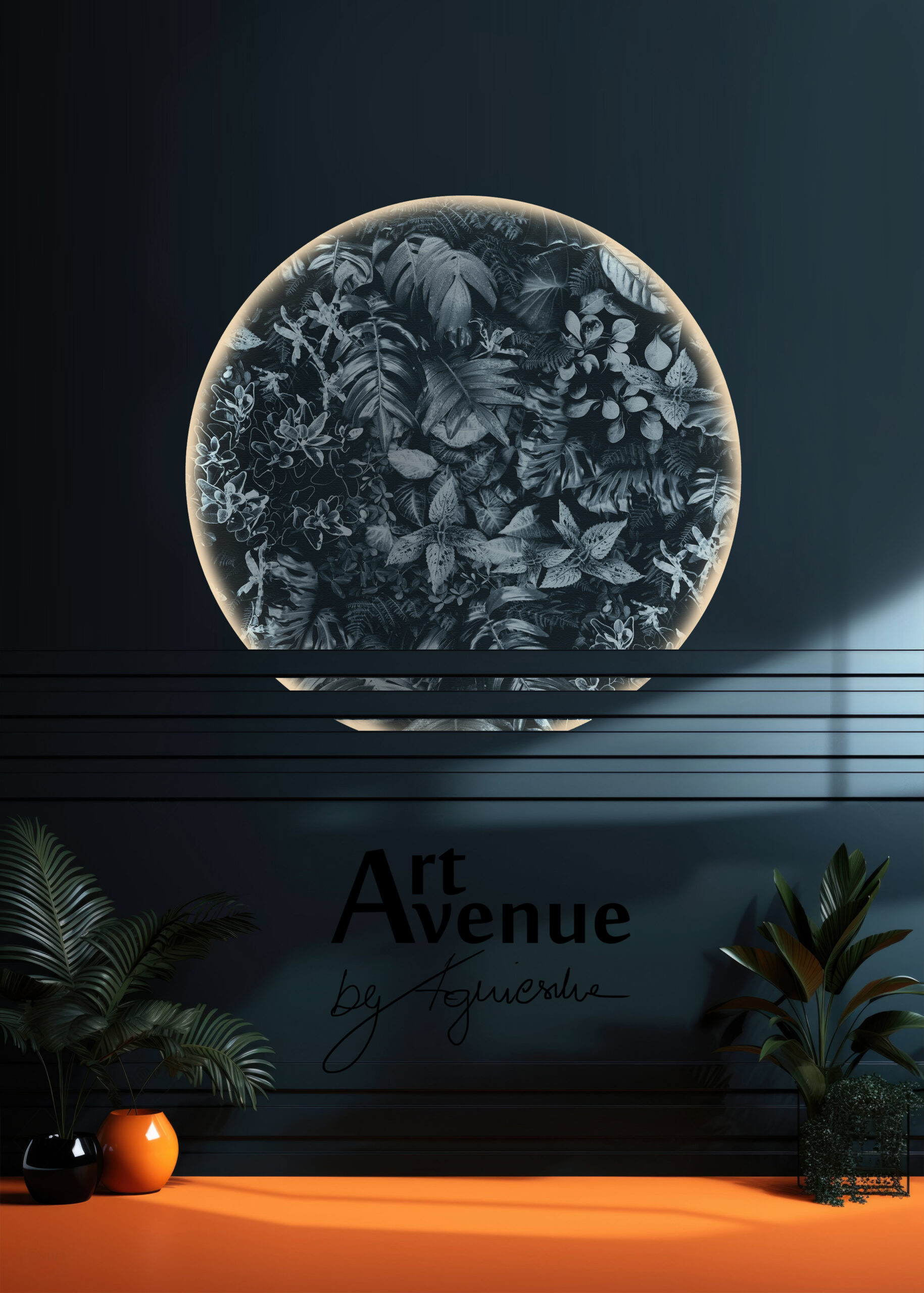 Skrywa ożywczy mix w kolorze nieco przygaszonej pomarańczy z bogatą kompozycją roślinną. Ta tapeta ma ukryty potencjał artystyczny do odważnych, kontrastowych projektów, wypełnień wnęk mebli i innych powierzchni. Artystyczna tapeta ścienna PREMIUM z motywem graficznym do zastosowania na ścianie, kaflach, meblach – w kształcie koła o średnicy 120 cm.
