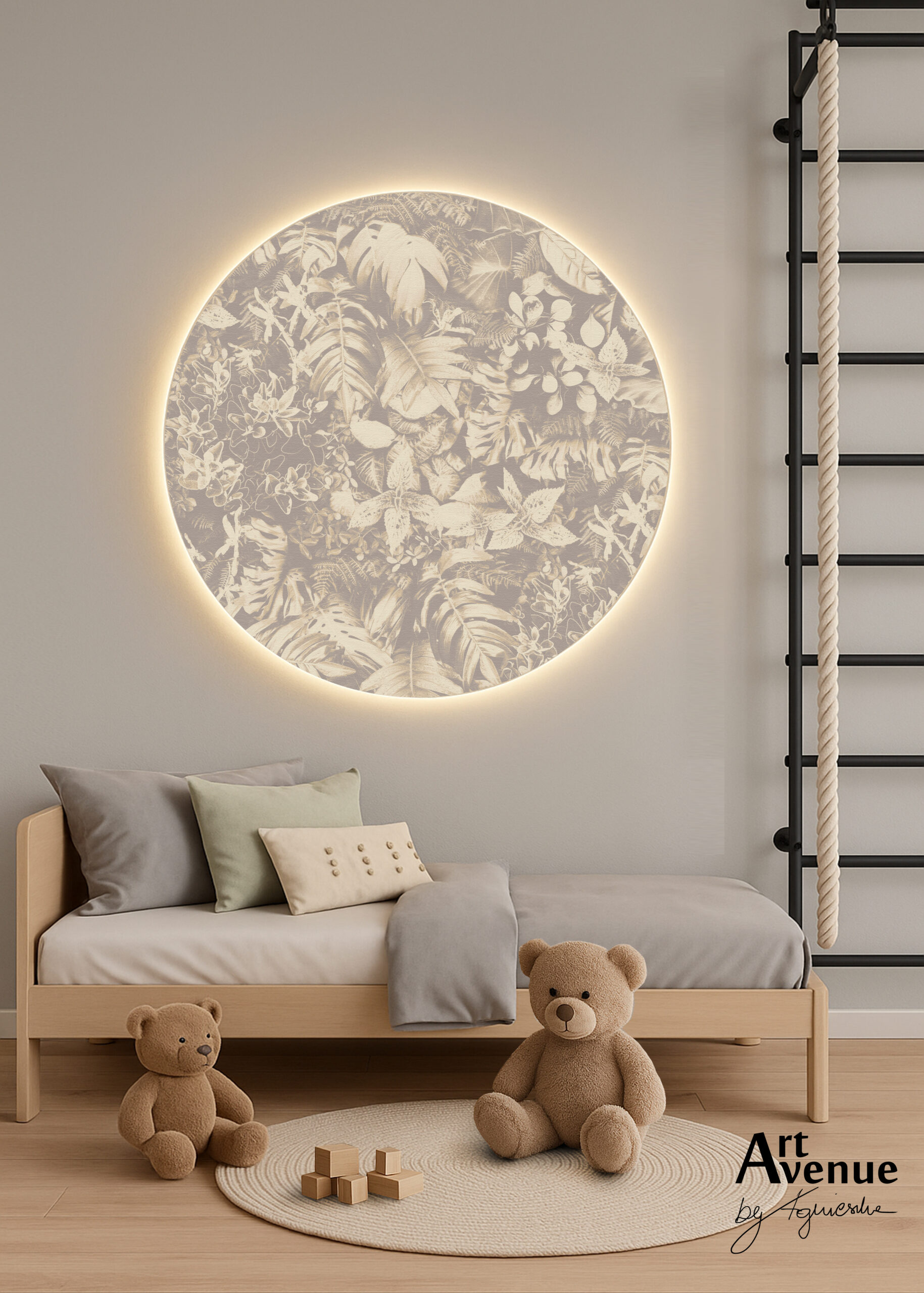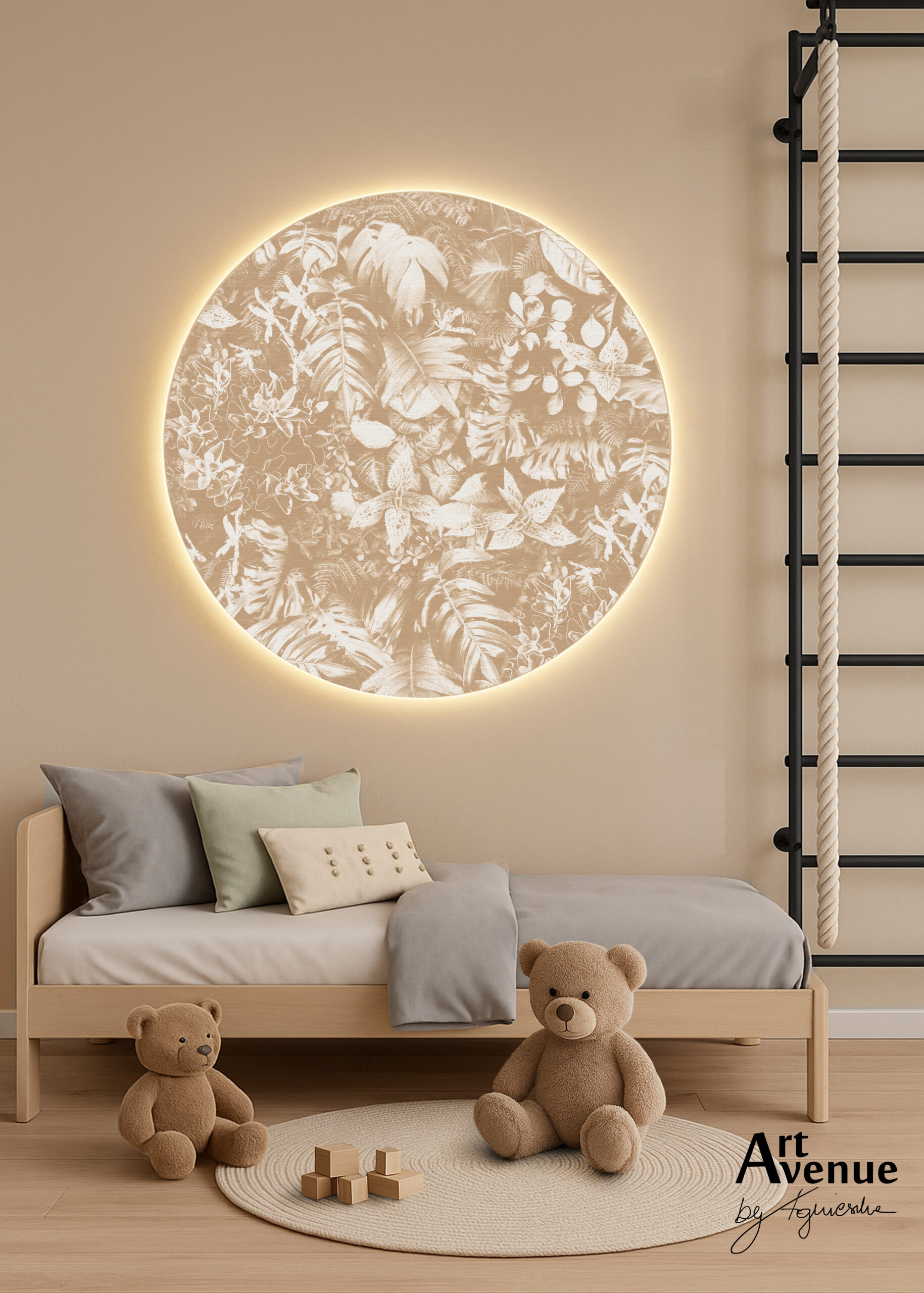 Ta roślinna propozycja w barwie ciepło-beżowej. Ze względu na swój potencjał przedstawiona została w wielu wariantach kolorystycznych, którymi odmienisz swoje otoczenie tworząc swój własny styl poza schematem. Artystyczna tapeta ścienna PREMIUM z motywem graficznym do zastosowania na ścianie, kaflach, meblach – w kształcie koła o średnicy 120 cm.
