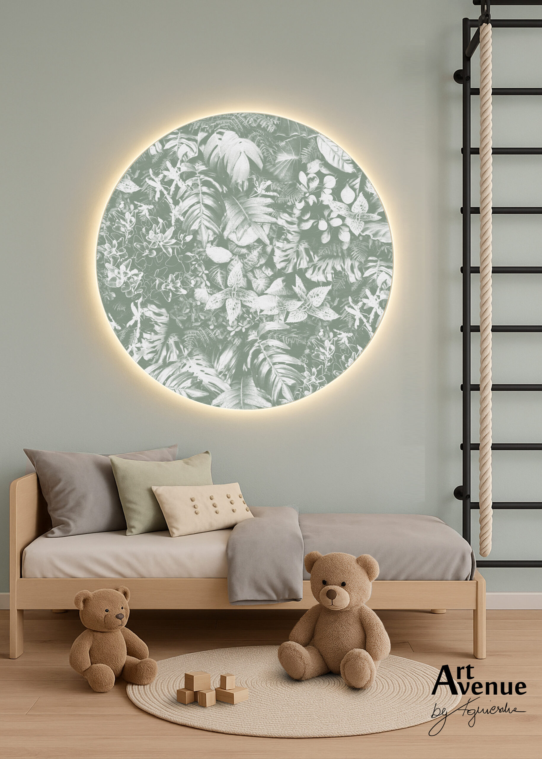 Przedstawia blado miętowy chic wraz z białym, rajskim wzorem. Roślinna kombinacja dynamizująca i orzeźwiająca wnętrze; świadomie odchodzi od klasyki wnętrzarskiej w celu zaspokojenia różnych potrzeb projektowych. Artystyczna tapeta ścienna PREMIUM z motywem graficznym do zastosowania na ścianie, kaflach, meblach – w kształcie koła o średnicy 120 cm.