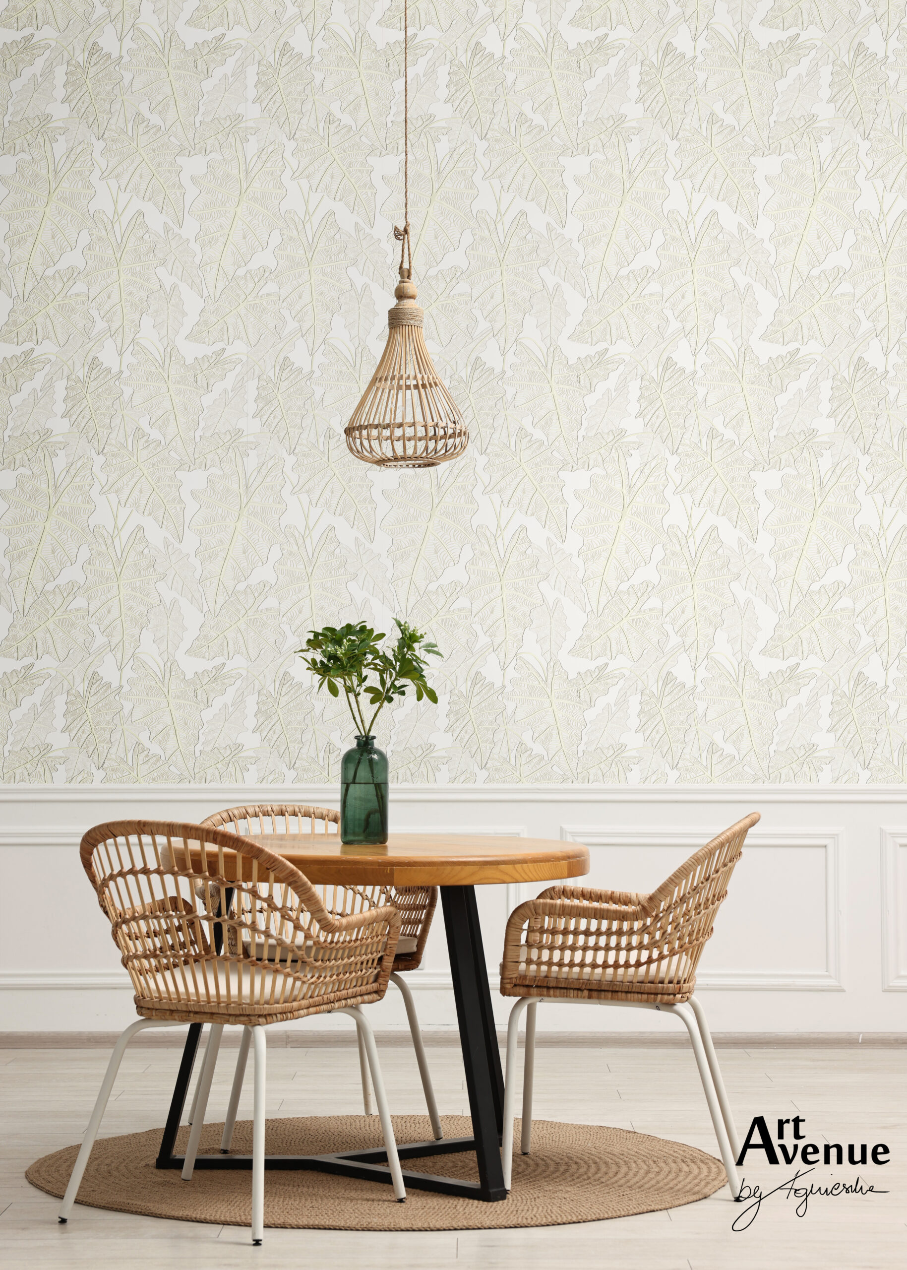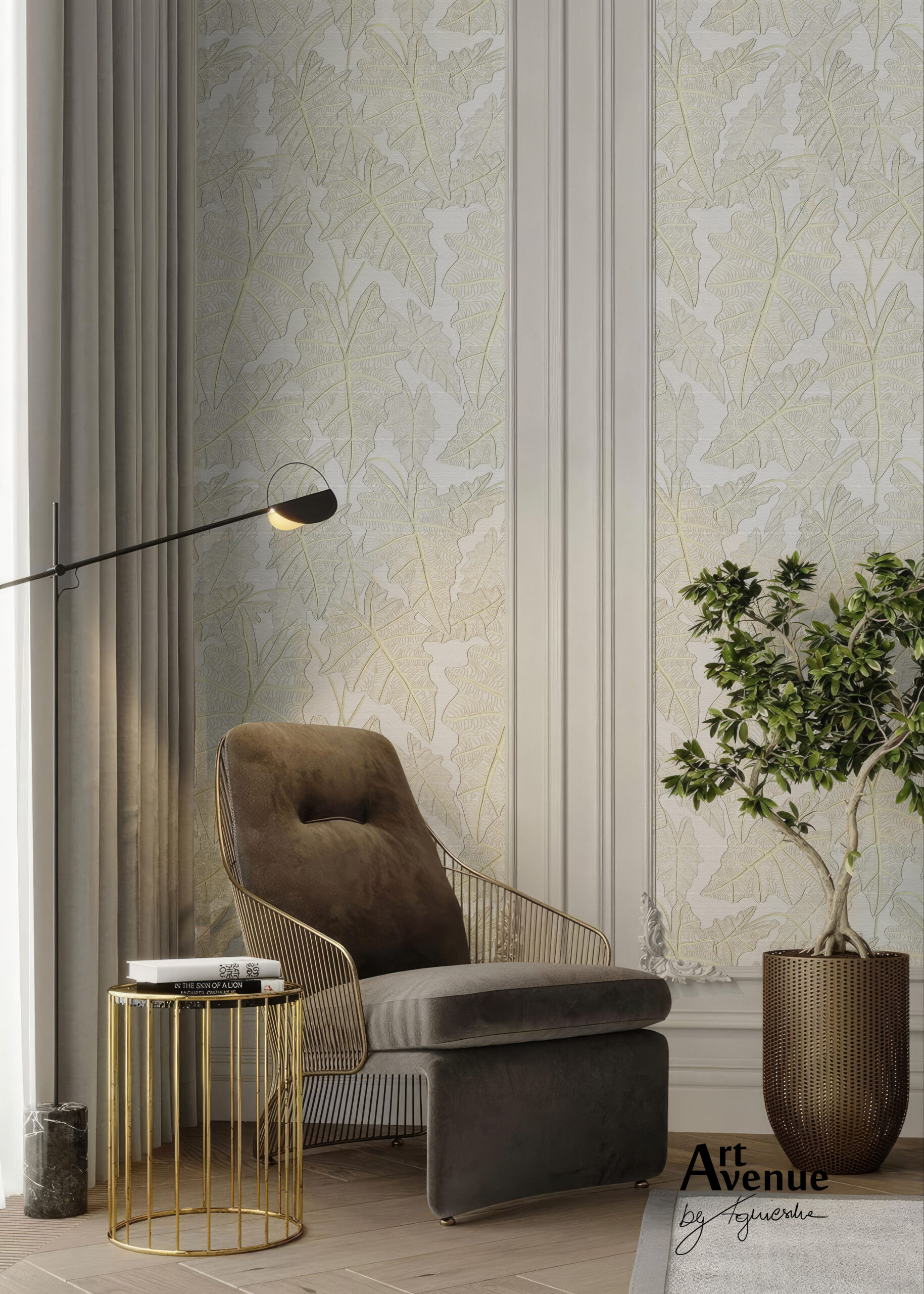 Jasnoszara propozycja z liśćmi alokazji, która stworzy subtelny nastrój w Twojej sypialni. To nienachalny sposób na otoczenie się motywem roślinnym, posiada ożywcze pożółcenia w nerwacji liści dające niebanalny efekt. Artystyczna tapeta ścienna PREMIUM z motywem botanicznym – na rolki.