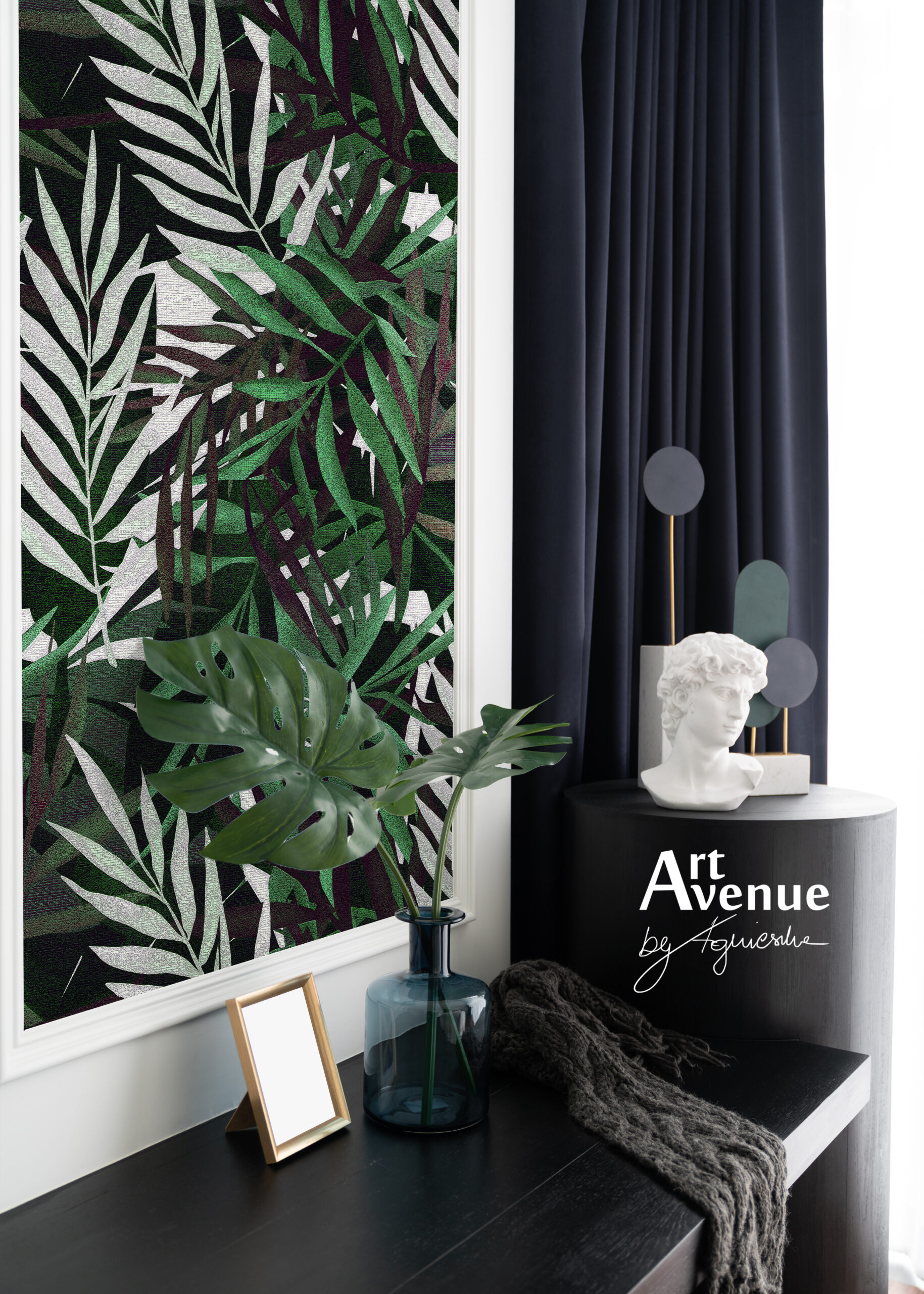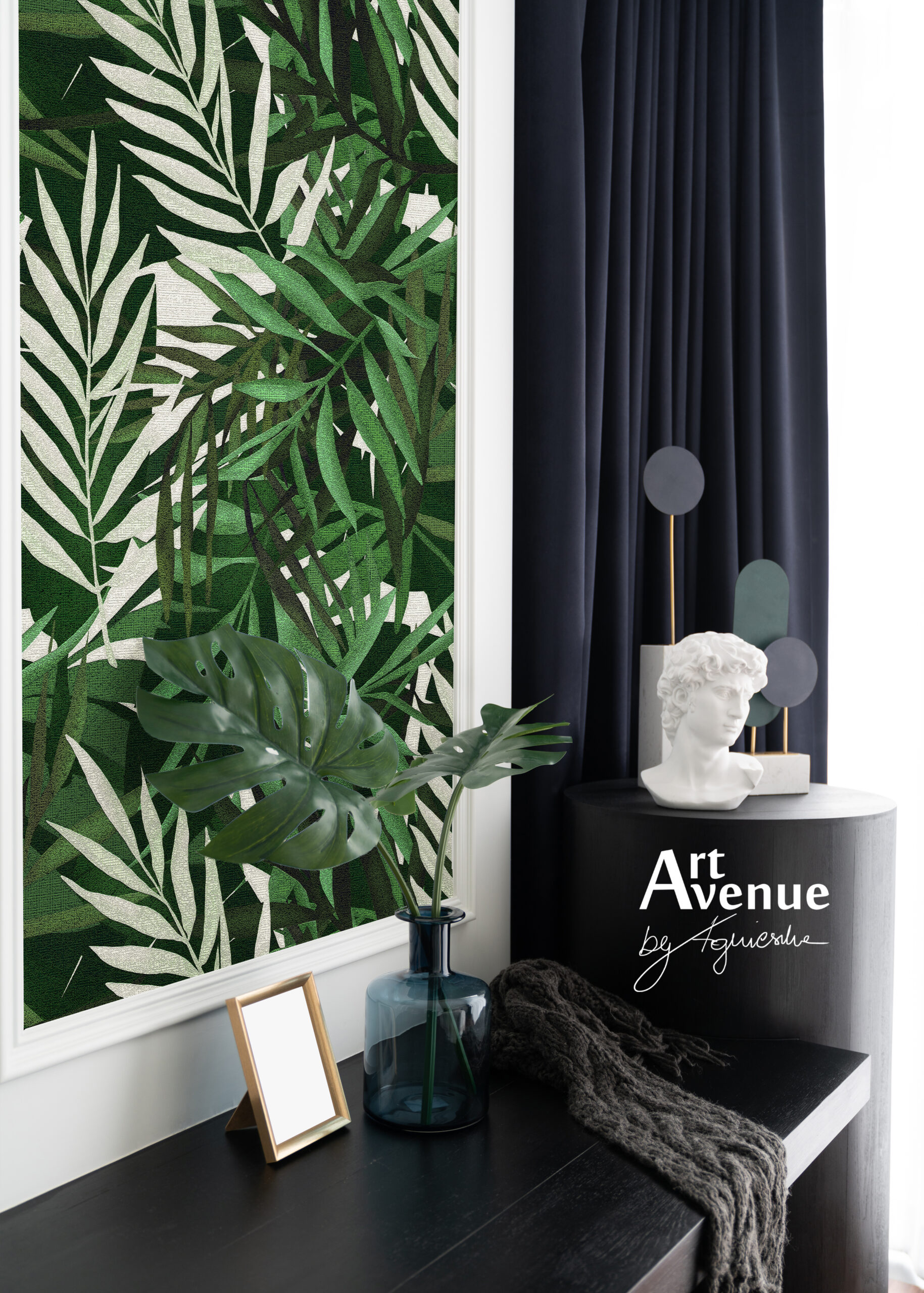 Grafika z tropikalnym zatrzęsieniem to zastępstwo w dobrym guście dla popularnej monstery. Na różnych płaszczyznach  tonów i tekstur opracowano oryginalny efekt, którego zastosowanie całkowicie odmieni wnętrze. Artystyczna tapeta ścienna PREMIUM z motywem graficznym – na rolki.